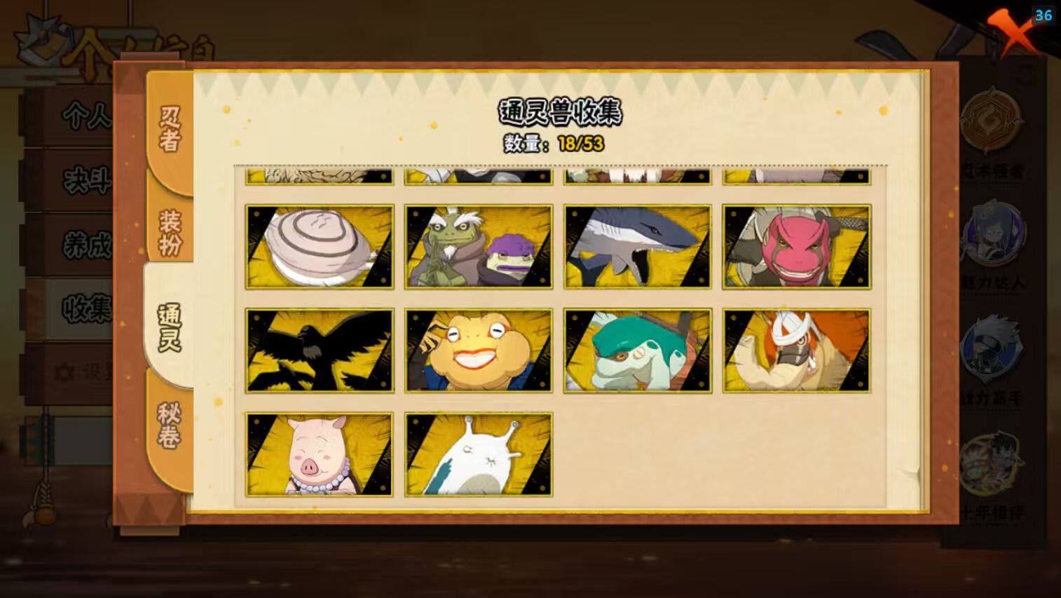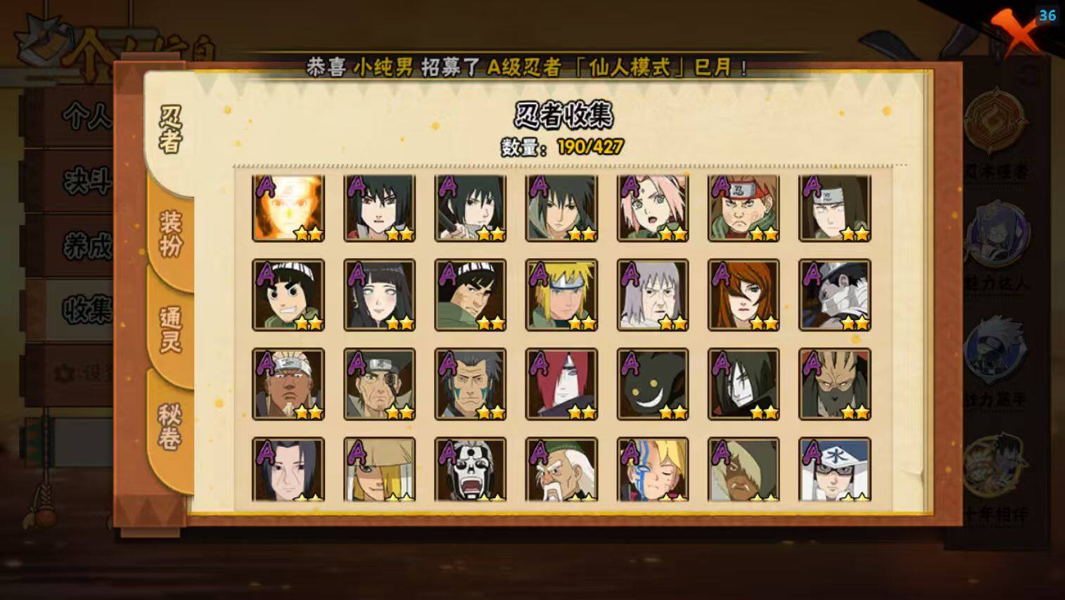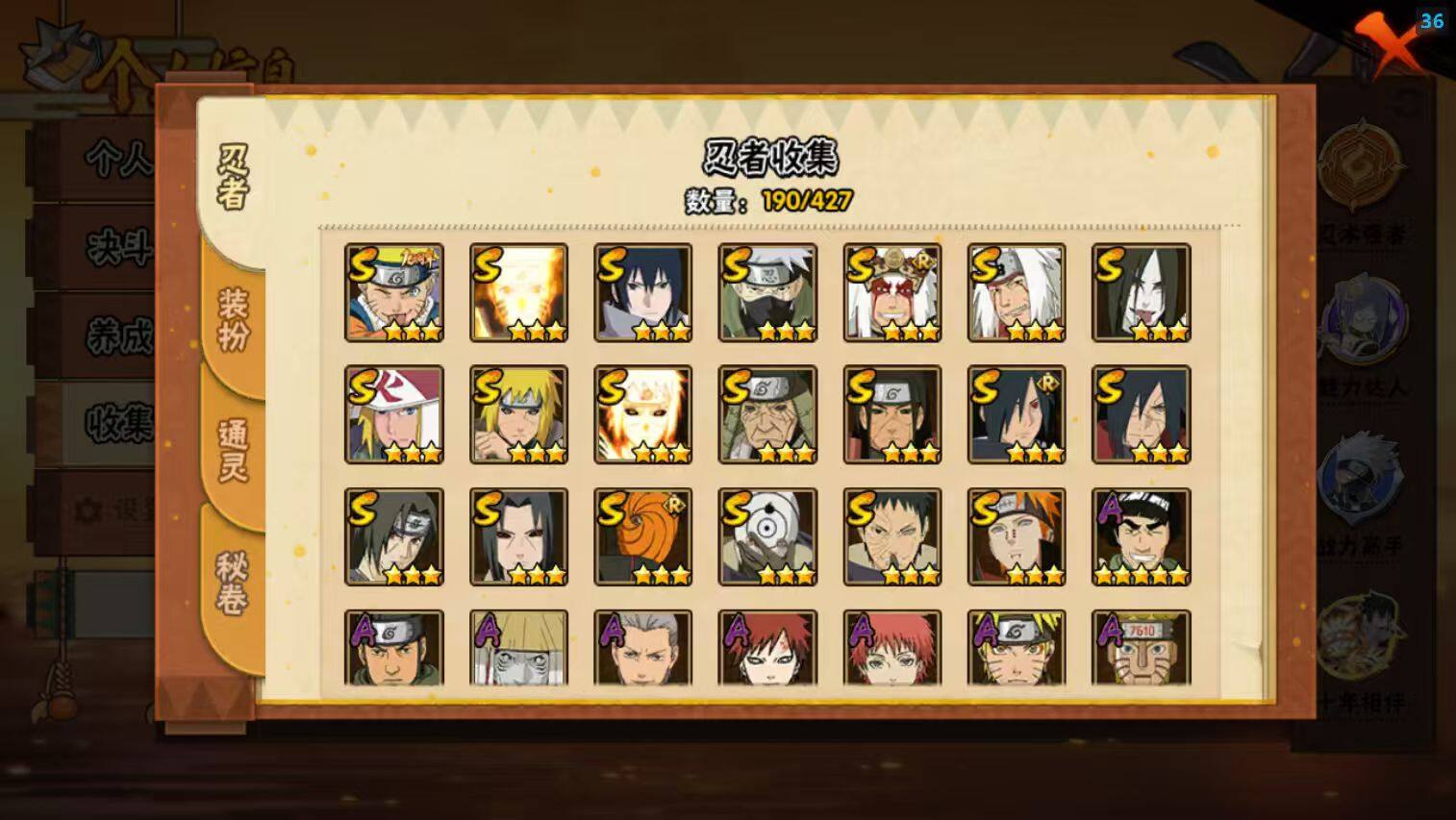 【A级忍者】:艾「青年」(2星),长门「青年」(2星),波风水门「青年」(2星),达鲁伊「博人传」(2星),迪达拉(2星),大蛇丸「晓」(2星),飞段(4星),飞段「死司凭血」(2星),干柿鬼鲛(5星),漩涡博人「桃式显现」(2星),漩涡鸣人「仙人模式」(2星),漩涡鸣人「九尾查克拉」(2星),机械鸣人「初始形态」(2星),迈特凯(5星),桃地再不斩「秽土转生」(2星),我爱罗「疾风传」(3星),蝎(3星),蝎「绯流琥」(2星),猿飞阿斯玛(5星),宇智波鼬「夏日限定」(2星),宇智波佐助「须佐能乎」(2星),宇智波佐助「万花筒写轮眼」(2星),照美冥「五代目水影」(2星),日向宁次「忍界大战」(2星),日向雏田「最终章」(2星),黑绝(2星),长十郎「六代目水影」(2星),李洛克「忍界大战」(2星),黑土「博人传」(2星),春野樱「百豪」(2星),秋道丁次「忍界大战」(2星),千代「近松十人卫」(2星),土台「忍界大战」(2星),宇智波泉奈(2星),不动(2星),大野木「侠隐江湖」(2星),巳月「仙人模式」(2星),迈特凯「青春爆炸」(2星)