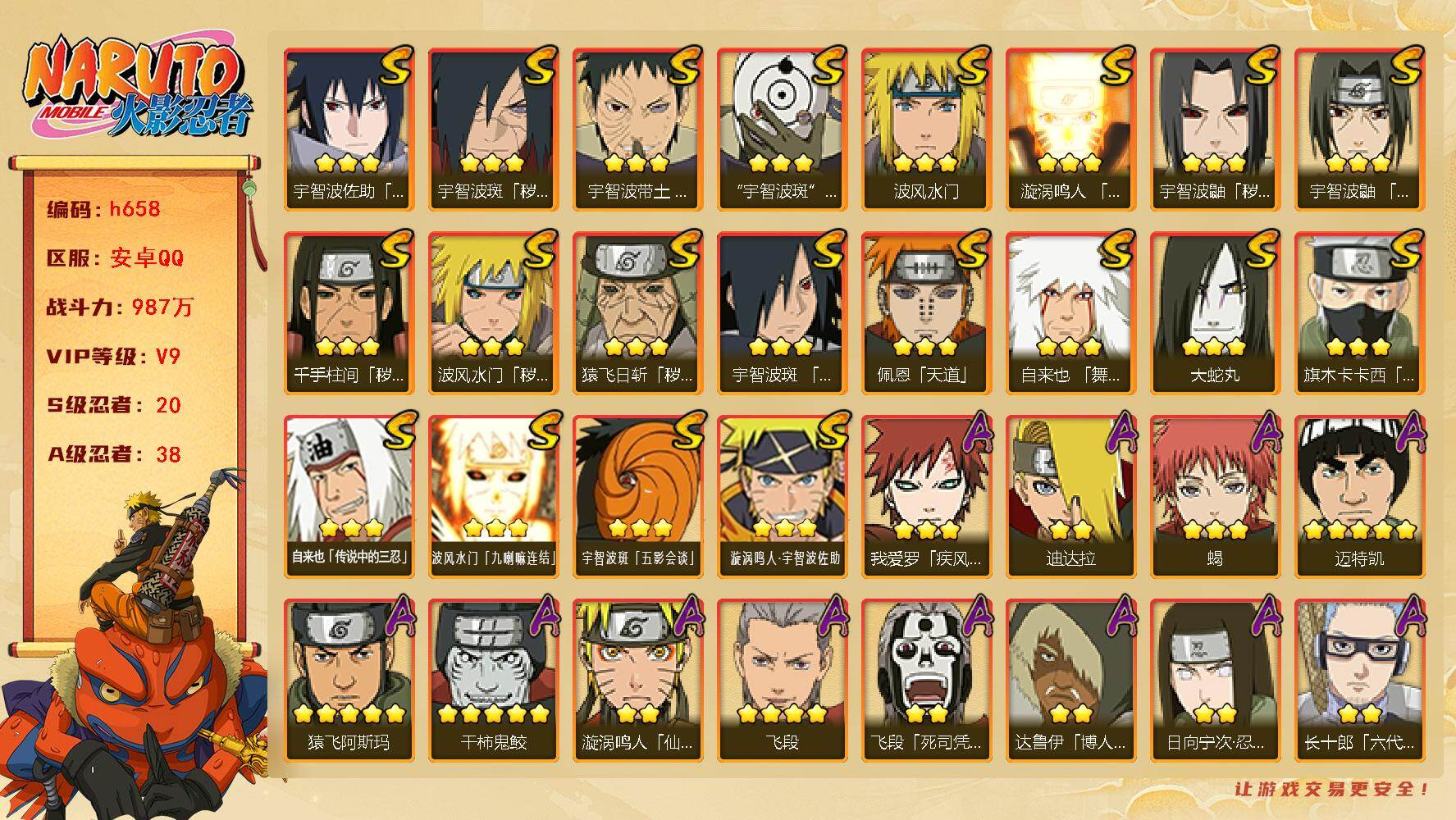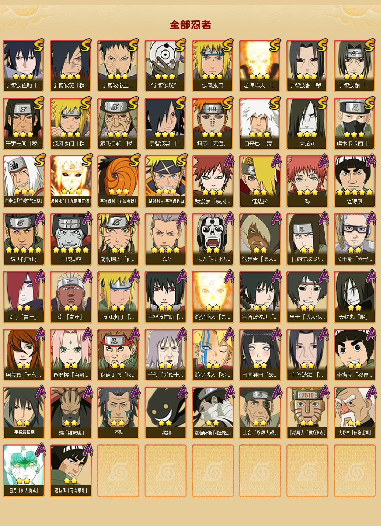 【S级忍者】:猿飞日斩「秽土转生」(3星),波风水门「秽土转生」(3星),千手柱间「秽土转生」(3星),宇智波鼬「秽土转生」(3星),宇智波斑「秽土转生·解」(3星),宇智波带土「忍界大战」(3星),宇智波鼬「须佐能乎」(3星),旗木卡卡西「须佐能乎」(3星),宇智波斑「木叶创立」(3星),自来也「舞之豪杰」(3星),大蛇丸(3星),自来也「传说中的三忍」(3星),波风水门(3星),漩涡鸣人「九喇嘛连结」(3星),佩恩「天道」(3星),宇智波佐助「永恒万花筒」(3星),宇智波斑 「白面具」(3星宇智波斑「白面具」),波风水门「九喇嘛连结」(3星),宇智波斑「五影会谈」(3星),漩涡鸣人·宇智波佐助(3星)