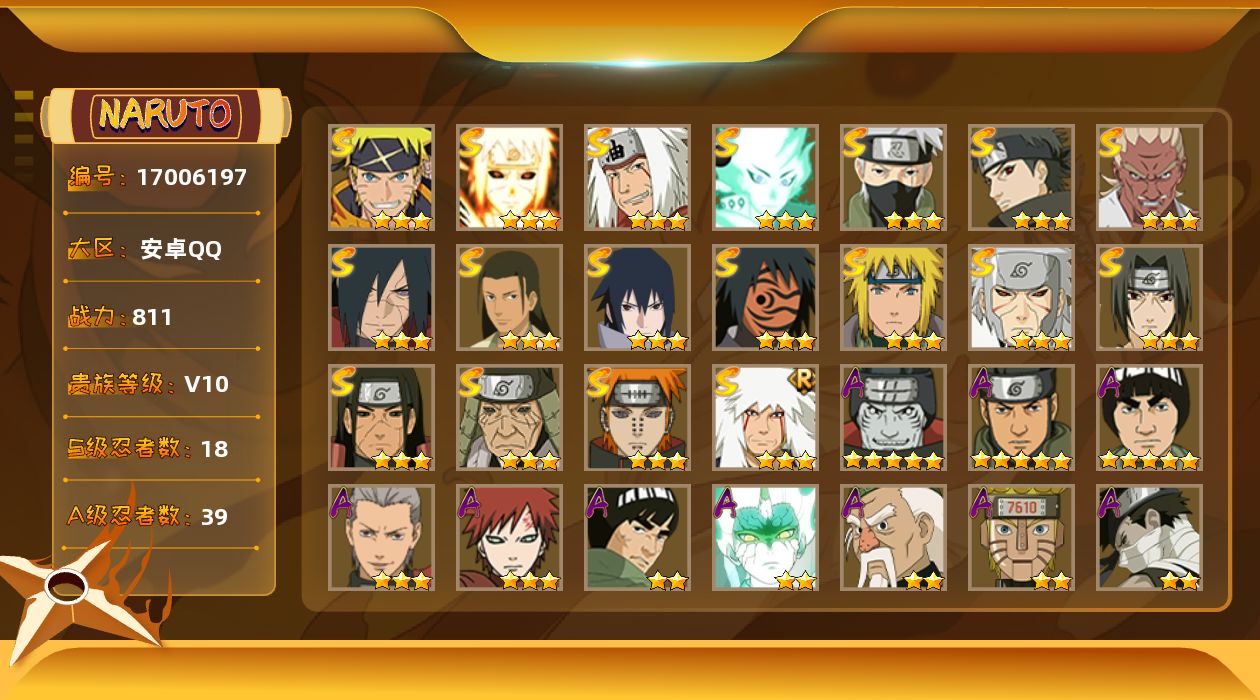 【S级忍者】:猿飞日斩「秽土转生」(3星),千手扉间「秽土转生」(3星),千手柱间「秽土转生」(3星),宇智波斑「秽土转生·解」(3星),艾「忍界大战」(3星),宇智波鼬「须佐能乎」(3星),宇智波止水「须佐能乎」(3星),旗木卡卡西「须佐能乎」(3星),千手柱间「木叶创立」(3星),自来也「舞之豪杰」(3星),自来也「传说中的三忍」(3星),波风水门(3星),神秘面具男「红夜之刃」(3星),佩恩「天道」(3星),宇智波佐助「永恒万花筒」(3星),大筒木舍人「最终章」(3星),波风水门「九喇嘛连结」(3星),漩涡鸣人·宇智波佐助(3星)