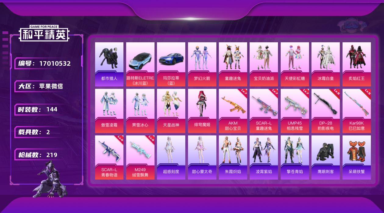 苹果 微信-10粉装-7特效枪-2载具-4粉色飞行器-68662热力值-16王牌印记-144套装-219枪皮
