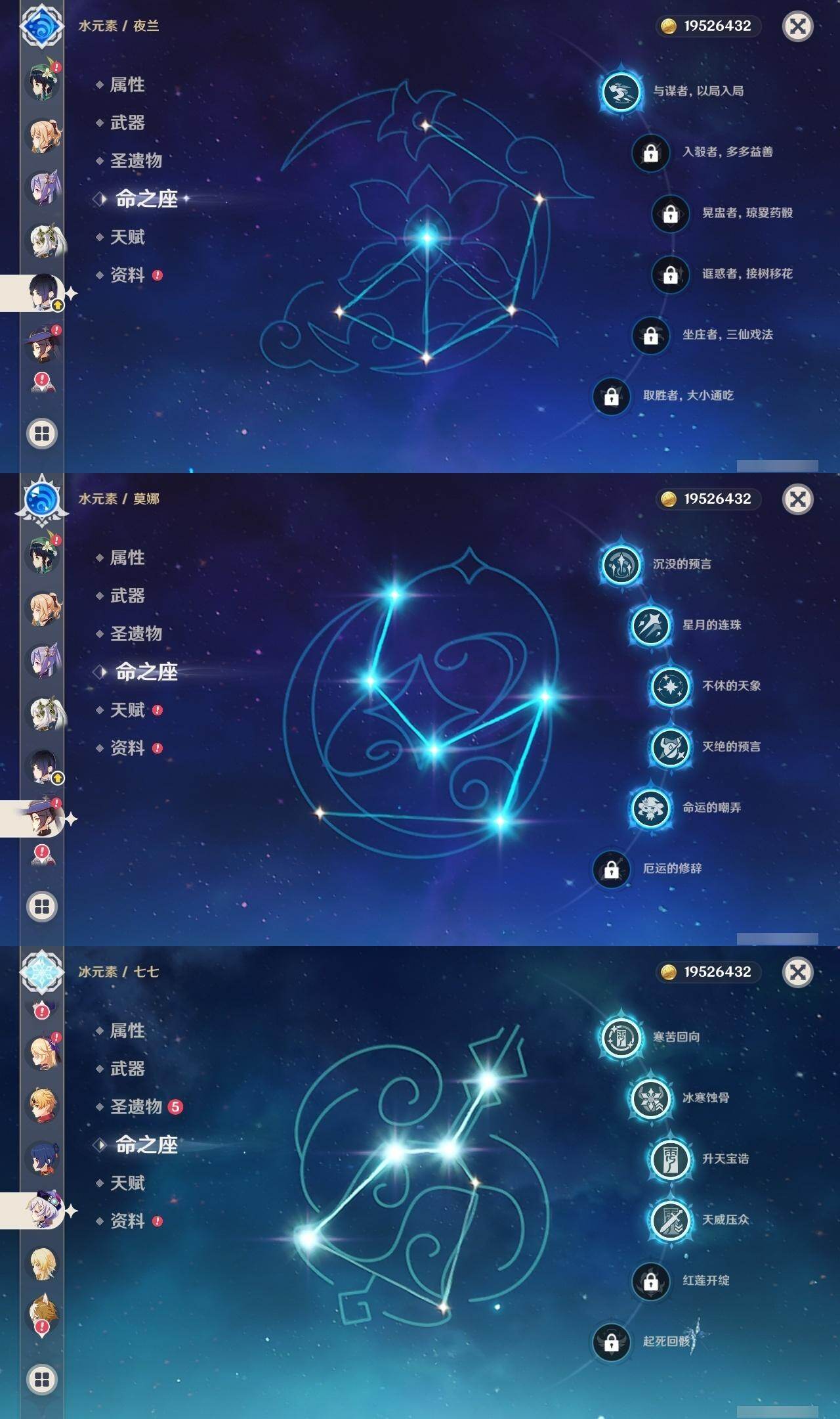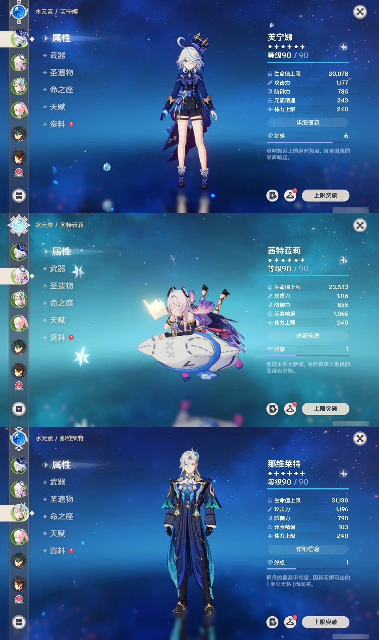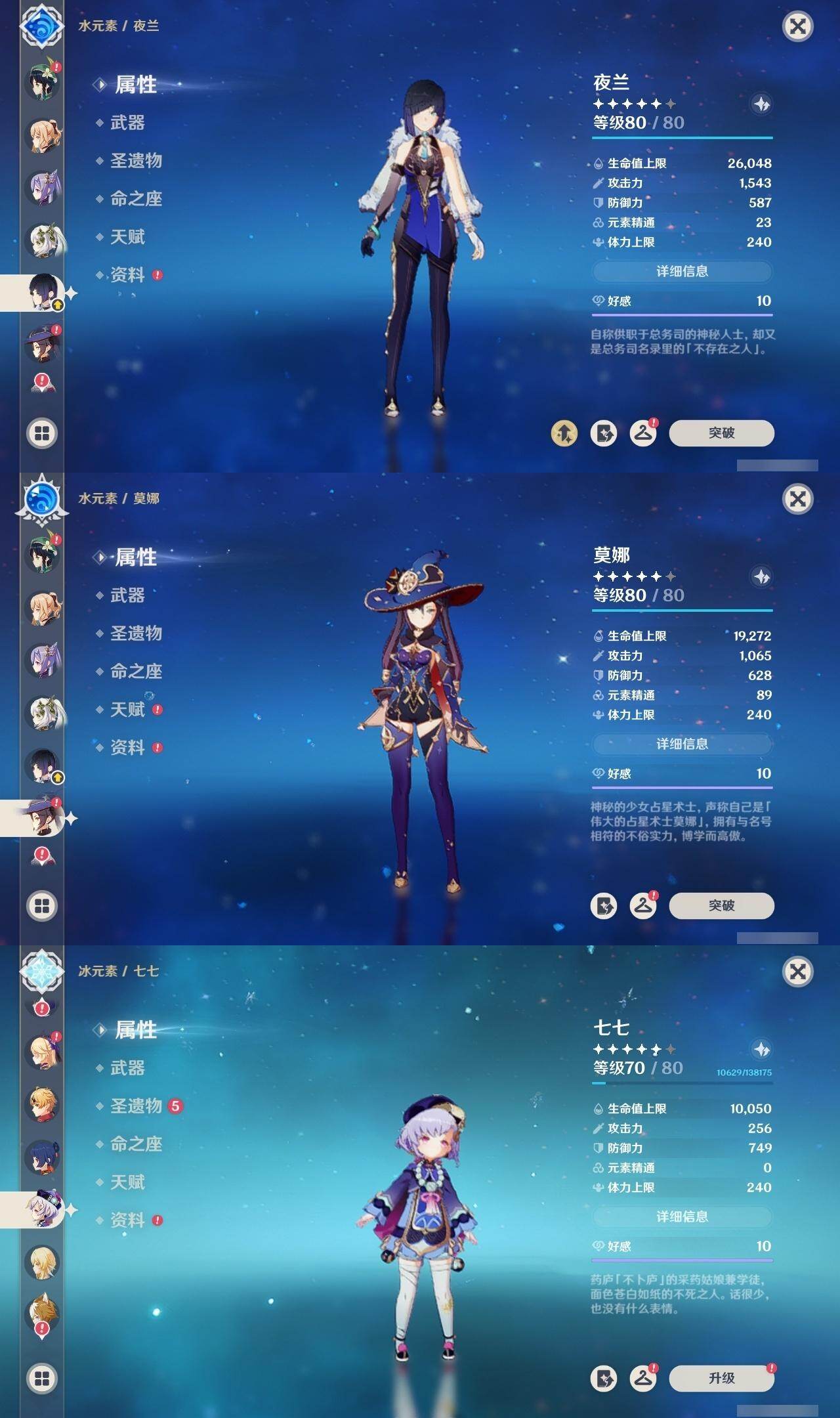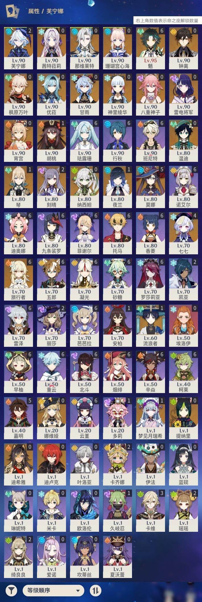 0命娜维娅,2命芙宁娜,0命那维莱特,0命迪希雅,1命流浪者,0命纳西妲,0命提纳里,1命夜兰,0命八重神子,0命优菈,0命雷电将军,0命枫原万叶,0命神里绫华,0命钟离,1命胡桃,0命甘雨,满命魈,0命宵宫,0命温迪,0命珊瑚宫心海,2命刻晴,4命七七,1命琴,5命莫娜,0命迪卢克,0命茜特菈莉,1命梦见月瑞希,精1白雨心弦,精1静水流涌之辉,精1千夜浮梦,精1若水,精1不灭月华,精1薙草之稻光,精1飞雷之弦振,精1护摩之杖,精1天空之脊,精1天空之翼,精1阿莫斯之弓,精1风鹰剑,精1狼的末路