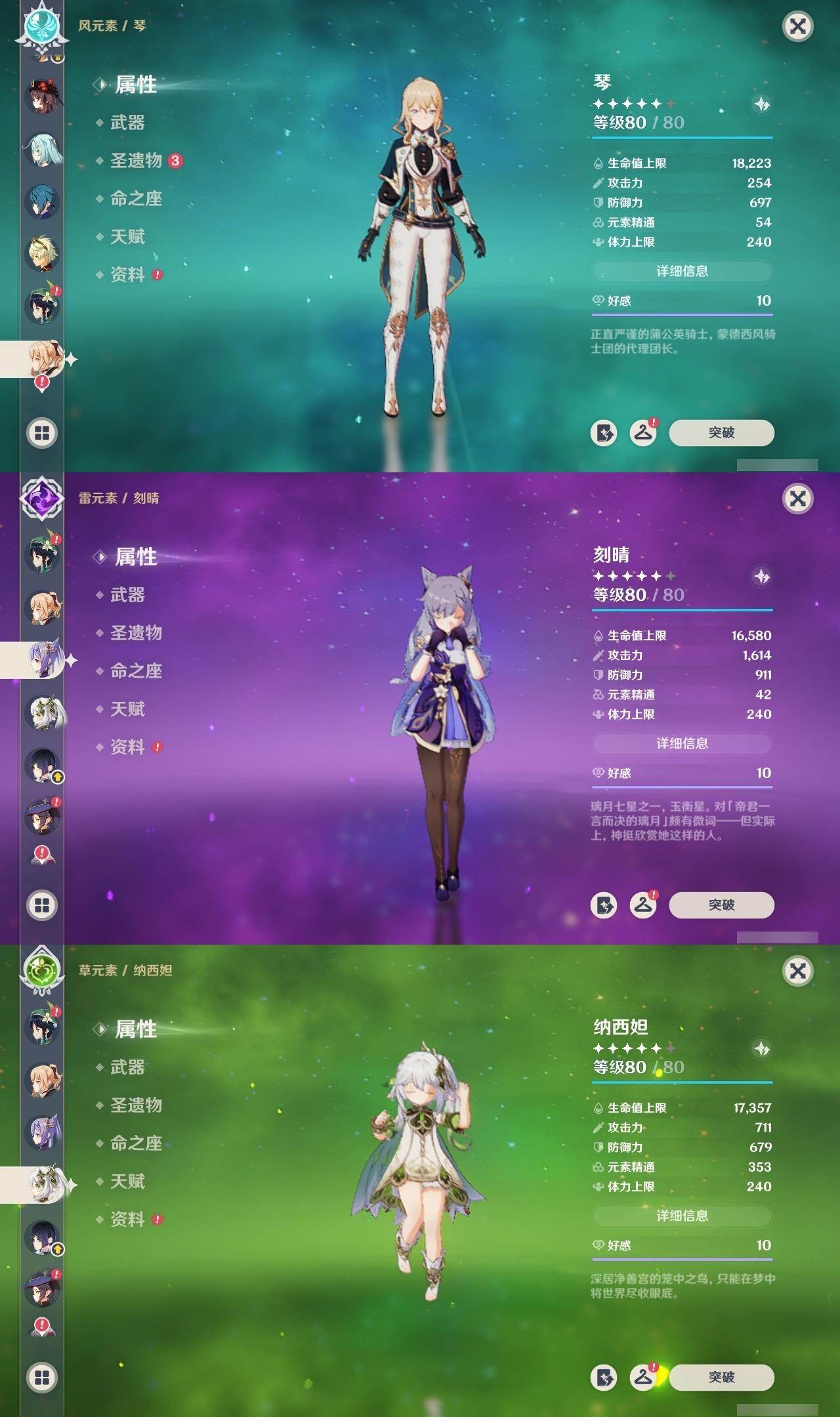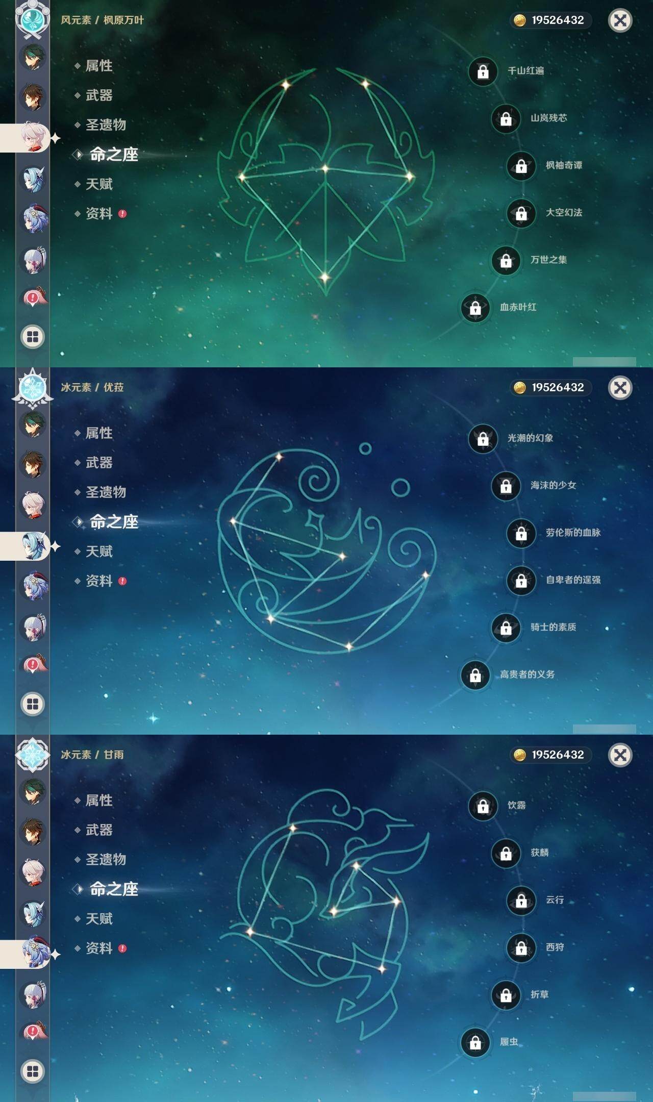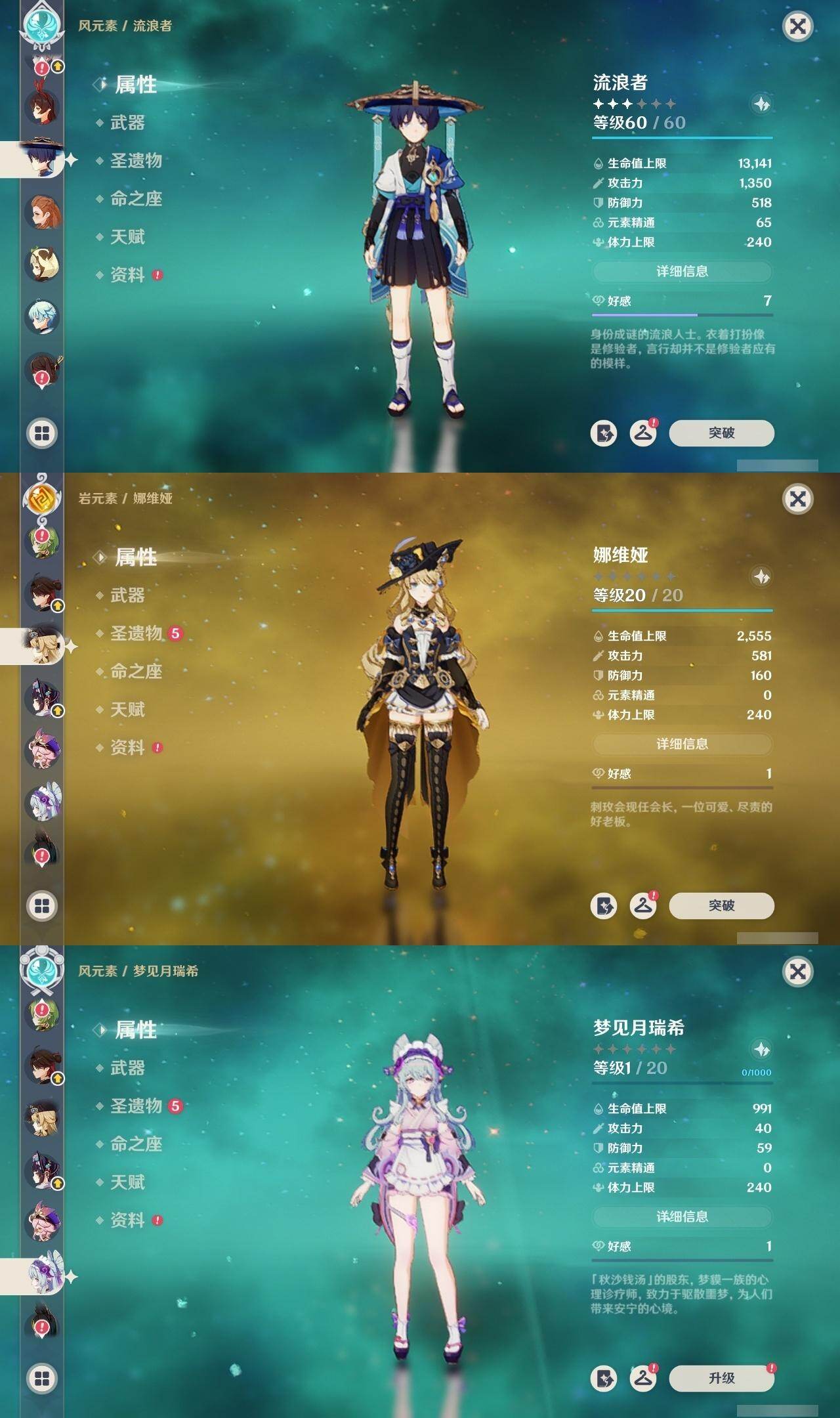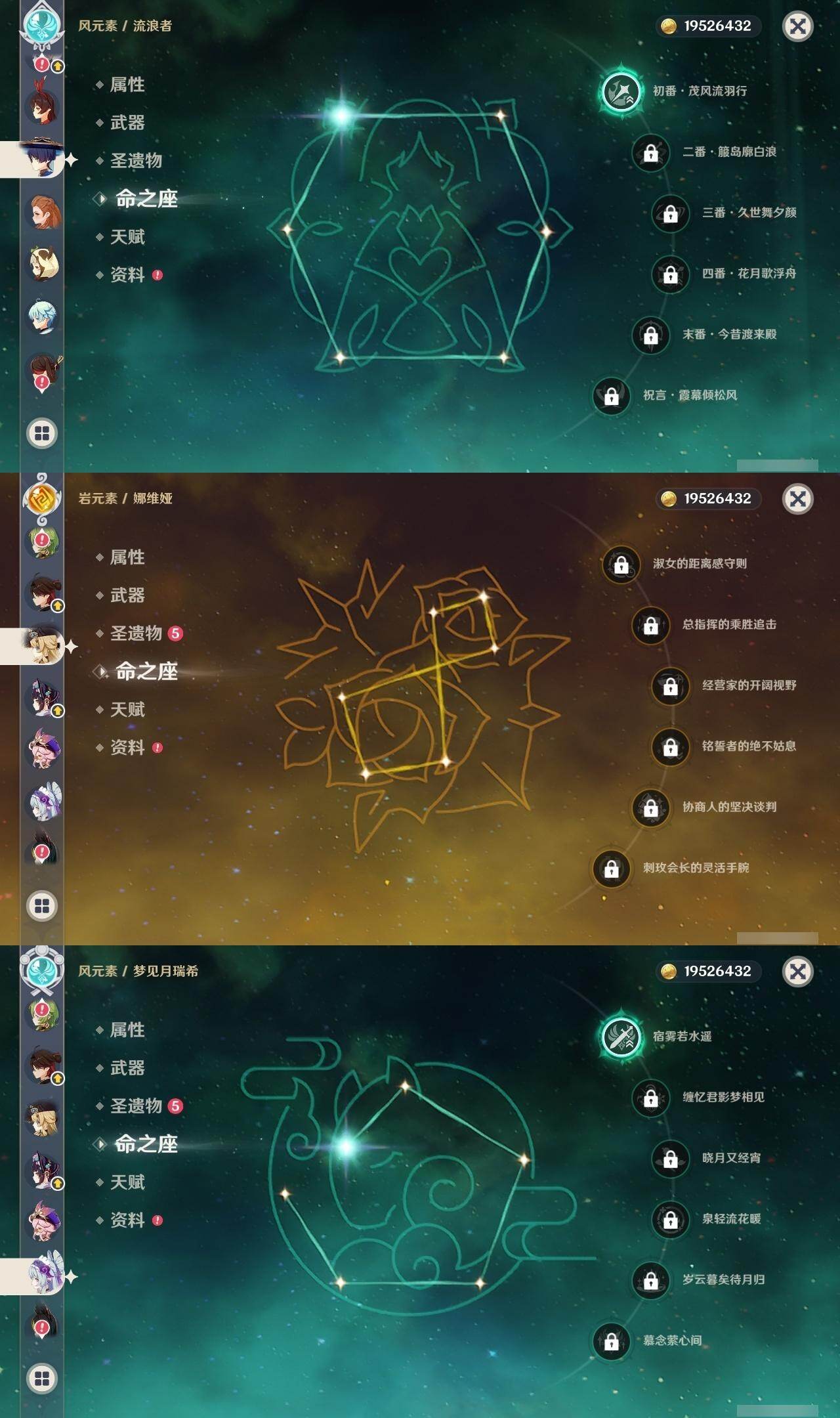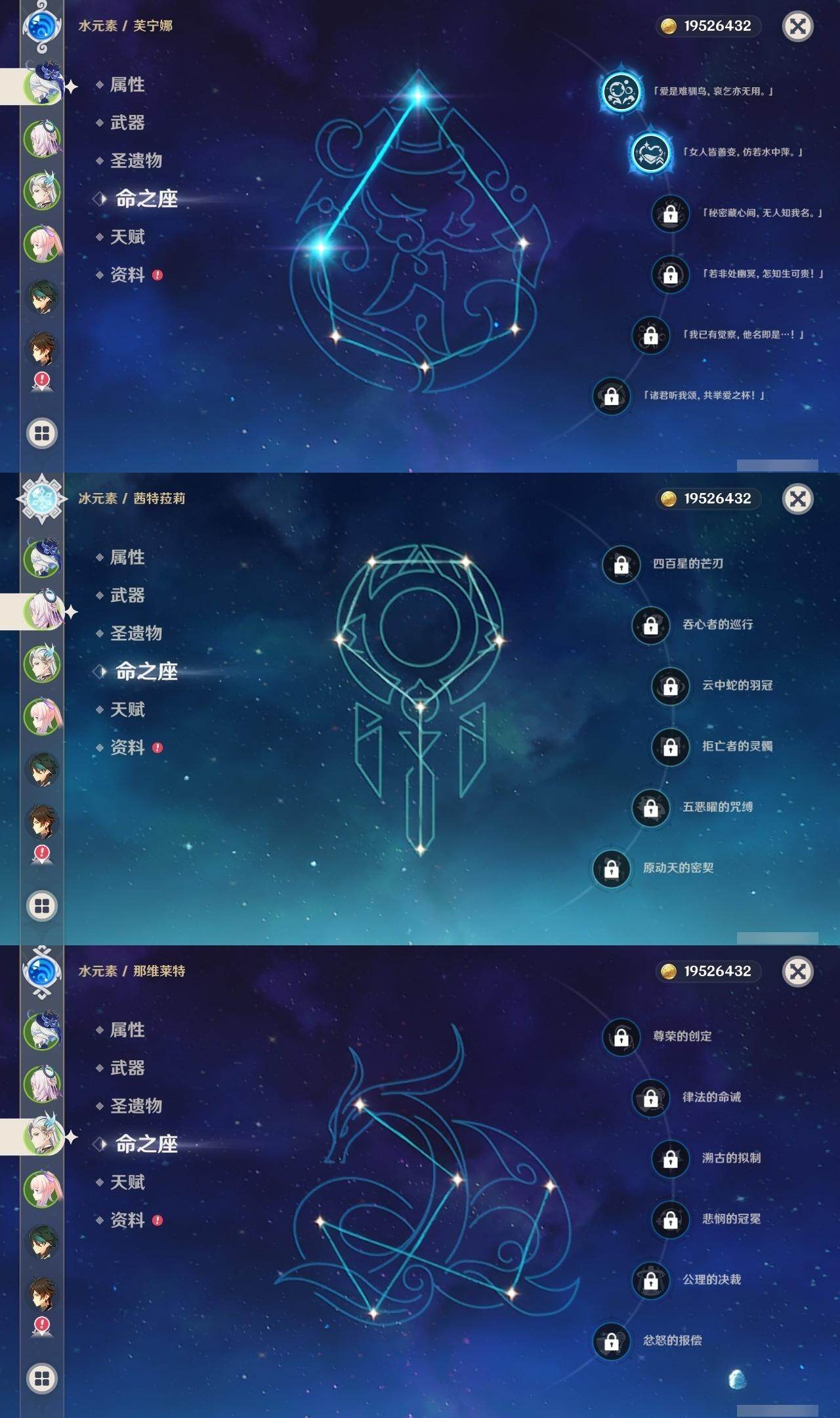 0命娜维娅,2命芙宁娜,0命那维莱特,0命迪希雅,1命流浪者,0命纳西妲,0命提纳里,1命夜兰,0命八重神子,0命优菈,0命雷电将军,0命枫原万叶,0命神里绫华,0命钟离,1命胡桃,0命甘雨,满命魈,0命宵宫,0命温迪,0命珊瑚宫心海,2命刻晴,4命七七,1命琴,5命莫娜,0命迪卢克,0命茜特菈莉,1命梦见月瑞希,精1白雨心弦,精1静水流涌之辉,精1千夜浮梦,精1若水,精1不灭月华,精1薙草之稻光,精1飞雷之弦振,精1护摩之杖,精1天空之脊,精1天空之翼,精1阿莫斯之弓,精1风鹰剑,精1狼的末路