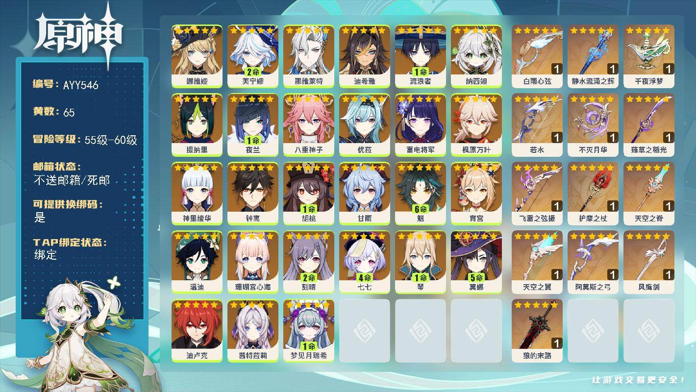 [17012872]60级/65黄/女主/27个五星角色/14个五星武器 0命娜维娅,2命芙宁娜,0命那维莱特,0命迪希雅,1命流浪者,0命纳西妲,0命提纳里,1命夜兰,0命八重神子,0命优菈,0命雷电将军,0命枫原万叶,0命神里绫华,0命钟离,1命胡桃,0命甘雨,满命魈,0命宵宫,0命温迪,0命珊瑚宫心海,2命刻晴,4命七七,1命琴,5命莫娜,0命迪卢克,0命茜特菈莉,1命梦见月瑞希,精1白雨心弦,精1静水流涌之辉,精1千夜浮梦,精1若水,精1不灭月华,精1薙草之稻光,精1飞雷之弦振,精1护摩之杖,精1天空之脊,精1天空之翼,精1阿莫斯之弓,精1风鹰剑,精1狼的末路