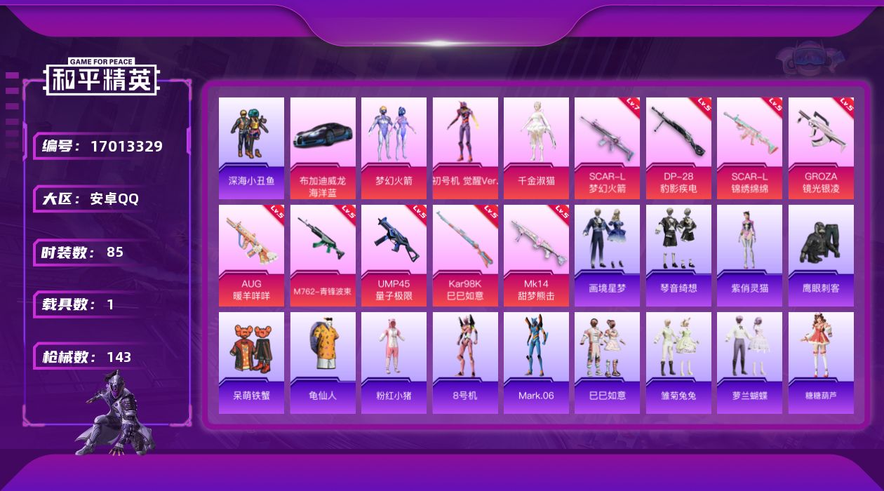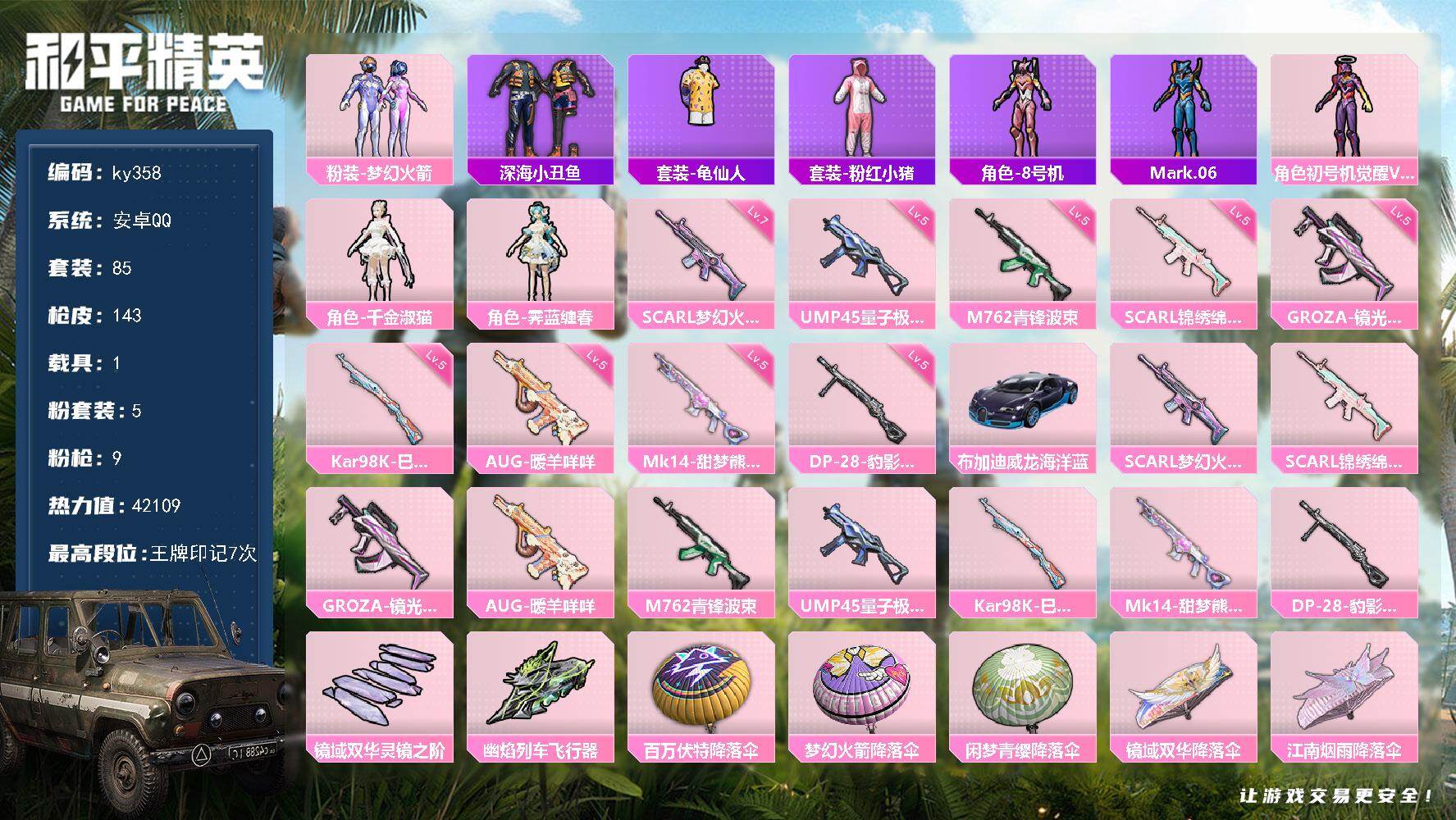 [17013329]安卓 手Q-5粉装-9特效枪-1载具-2粉色飞行器-42109热力值-7王牌印记-85套装-143枪皮