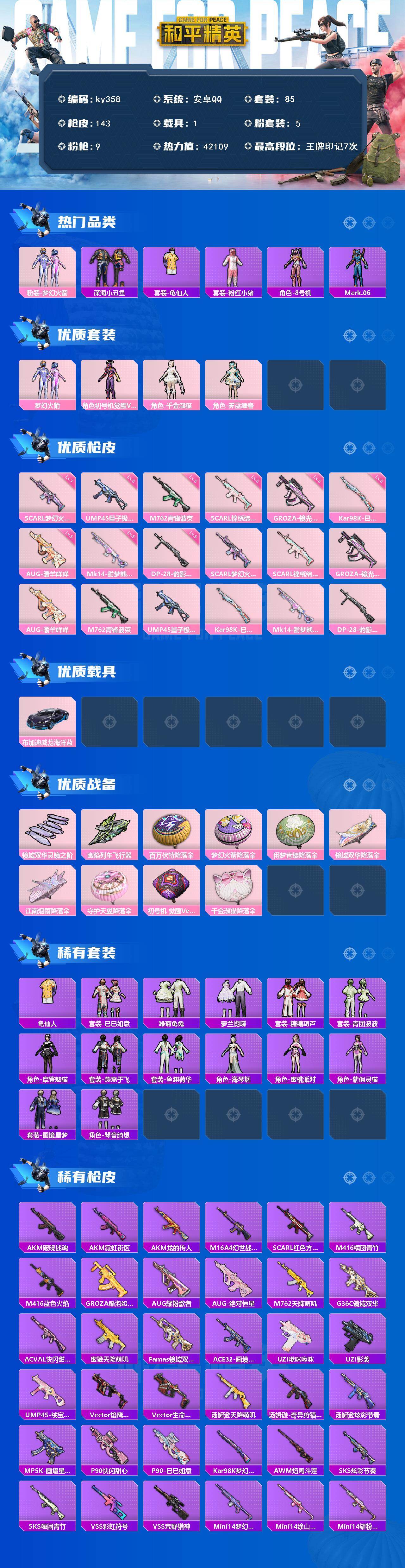 [17013329]安卓 手Q-5粉装-9特效枪-1载具-2粉色飞行器-42109热力值-7王牌印记-85套装-143枪皮 【热门品类】:粉装-梦幻火箭,套装-深海小丑鱼,套装-龟仙人,套装-粉红小猪,角色-8号机,角色-Mark.06 【粉色套装】:粉装-梦幻火箭,角色-初号机 觉醒Ver.,角色-千金淑猫,角色-霁蓝缠春 【粉色枪皮等级】:SCAR-L-梦幻火箭(七级),SCAR-L-锦绣绵绵(五级),GROZA-镜光银凌(五级),AUG-暖羊咩咩(五级),M762-青锋波束(五级),UMP45-量子极限(五级),Kar98K-巳巳如意(五级),Mk14-甜梦熊击(五级),DP-28-豹影疾电(五级) 【粉色载具】:布加迪威龙(海洋蓝) 【粉色枪皮】:SCAR-L-梦幻火箭,SCAR-L-锦绣绵绵,GROZA-镜光银凌,AUG-暖羊咩咩,M762-青锋波束,UMP45-量子极限,Kar98K-巳巳如意,Mk14-甜梦熊击,DP-28-豹影疾电 【粉色飞行器】:镜域双华-灵镜之阶,幽焰列车飞行器 【粉色降落伞】:百万伏特降落伞,梦幻火箭降落伞,闲梦青缨降落伞,镜域双华降落伞,江南烟雨降落伞,守护天翼降落伞,初号机 觉醒Ver.降落伞,千金淑猫降落伞 【稀有套装】:套装-龟仙人,套装-巳巳如意,套装-雪国风尚,套装-雏菊兔兔,套装-萝兰蝴蝶,套装-糖糖葫芦,套装-青团波波,角色-摩登魅猫,套装-燕燕于飞,套装-鱼渊荷华,角色-海琴烟,角色-蜜桃派对,角色-紫俏灵猫,套装-画境星梦,套装-琴音绮想 【稀有枪皮】:AKM-破晓战魂,AKM-霓虹街区,AKM-龙的传人,M16A4-幻世战舞者,SCAR-L-红色方程式,M416-糯团青竹,M416-蓝色火焰,GROZA-酷泡奶龙,AUG-耀粉歌者,AUG-绝对恒星,M762-天降萌叽,G36C-镜域双华,AC-VAL-快闪甜心,蜜獾-天降萌叽,Famas-镜域双华,ACE32-画境星梦,UZI-啾咪啾咪,UZI-影袭,UMP45-绒宝小鹅,Vector-焰鹰斗篷,Vector-生命誓言,汤姆逊-天降萌叽,汤姆逊-奇异狩猎者,汤姆逊-炫彩节奏,MP5K-画境星梦,P90-快闪甜心,P90-巳巳如意,Kar98K-梦幻火箭,AWM-焰鹰斗篷,SKS-炫彩节奏,SKS-糯团青竹,VSS-彩虹符号,VSS-荒野猎神,Mini14-辉耀战甲,Mini