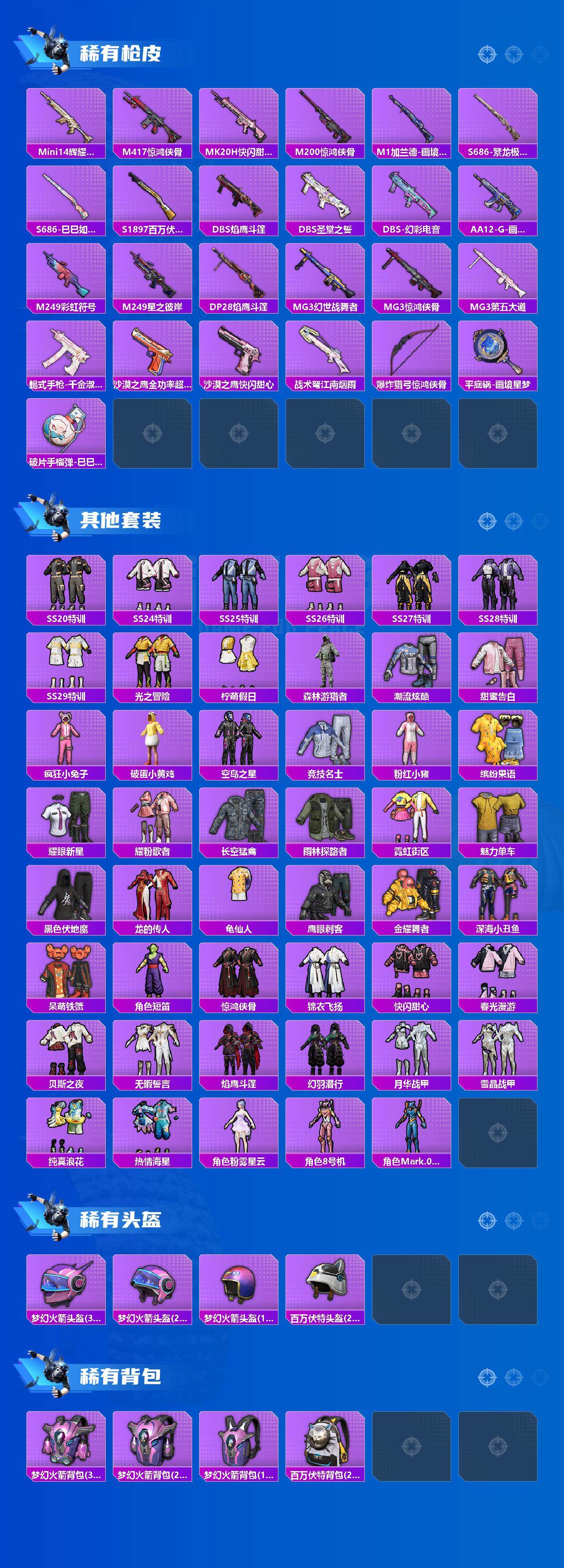 【稀有枪皮】:AKM-破晓战魂,AKM-霓虹街区,AKM-龙的传人,M16A4-幻世战舞者,SCAR-L-红色方程式,M416-糯团青竹,M416-蓝色火焰,GROZA-酷泡奶龙,AUG-耀粉歌者,AUG-绝对恒星,M762-天降萌叽,G36C-镜域双华,AC-VAL-快闪甜心,蜜獾-天降萌叽,Famas-镜域双华,ACE32-画境星梦,UZI-啾咪啾咪,UZI-影袭,UMP45-绒宝小鹅,Vector-焰鹰斗篷,Vector-生命誓言,汤姆逊-天降萌叽,汤姆逊-奇异狩猎者,汤姆逊-炫彩节奏,MP5K-画境星梦,P90-快闪甜心,P90-巳巳如意,Kar98K-梦幻火箭,AWM-焰鹰斗篷,SKS-炫彩节奏,SKS-糯团青竹,VSS-彩虹符号,VSS-荒野猎神,Mini14-辉耀战甲,Mini