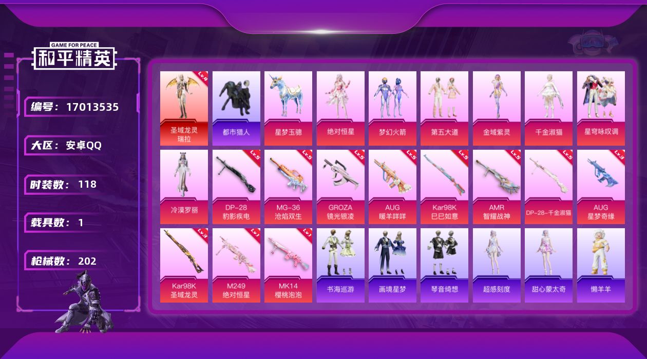 [17013535]安卓 手Q-1神装-8粉装-11特效枪-1载具-6粉色飞行器-65568热力值-7王牌印记-118套装-202枪皮 【红色神装等级】:圣域龙灵-瑞拉(四级) 【红色角色神装】:圣域龙灵-瑞拉 【热门品类】:粉装-梦幻火箭,套装-都市猎人,套装-粉红小猪,套装-萌熊伴侣 【粉色套装】:角色-绝对恒星,粉装-梦幻火箭,粉装-第五大道,角色-金域紫灵,角色-千金淑猫,粉装-星穹咏叹调,角色-冷漠罗丽,角色-罪夜之冕 【粉色枪皮等级】:GROZA-镜光银凌(五级),AUG-星梦奇缘(三级),AUG-暖羊咩咩(五级),Kar98K-巳巳如意(五级),Kar98K-圣域龙灵(三级),Mk14-樱桃泡泡(一级),AMR-智耀战神(五级),M249-绝对恒星(一级),DP-28-千金淑猫(五级),DP-28-豹影疾电(五级),MG-36-沧焰双生(五级) 【粉色载具】:僚机-圣域龙宝,星梦玉骢 【粉色枪皮】:GROZA-镜光银凌,AUG-星梦奇缘,AUG-暖羊咩咩,Kar98K-巳巳如意,Kar98K-圣域龙灵,Mk14-樱桃泡泡,AMR-智耀战神,M249-绝对恒星,DP-28-千金淑猫,DP-28-豹影疾电,MG-36-沧焰双生 【粉色飞行器】:绝对恒星飞行器,炫彩糖果飞行器,圣域金龙飞行器,终晖之翼飞行器,宁雨蝶飞行器,暮色之舞飞行器 【粉色降落伞】:绝对恒星降落伞,梦幻火箭降落伞,炫紫旋律降落伞,环太平洋降落伞,第五大道降落伞,星梦奇缘降落伞,幽焰骑士降落伞,千金淑猫降落伞,临安公主降落伞,脆鲨七海降落伞,彩虹独角兽降落伞,樱桃泡泡降落伞,圣域龙灵降落伞,智耀战神降落伞,星穹咏叹调降落伞,辉羽雀灵降落伞,幻彩电音降落伞,宁雨蝶降落伞,灵猫魔法师降落伞,绯穹魔姬降落伞,喜羊羊与灰太狼降落伞,炫彩糖果降落伞,暮色玫影降落伞,罪夜之冕降落伞 【稀有套装】:套装-巳巳如意,套装-乐游熊熊,角色-超感刻度,角色-甜心蒙太奇,套装-雪国风尚,套装-炫彩糖果,套装-雏菊兔兔,套装-萝兰蝴蝶,套装-小熊娃娃,角色-狂花道·雅典娜,套装-速跑银狼,套装-糖糖葫芦,套装-青团波波,套装-棉花软糖,角色-都市丽猫,角色-摩登魅猫,角色-光矢逐梦,套装-燕燕于飞,套装-鱼渊荷华,角色-风玲,角色-糖霜甜心,角色-蜜桃派对,套装-焰舞炽心,套装-粉恋花,套装-紫幽梦,套装-蓝冰羽,角色-猎影月神,