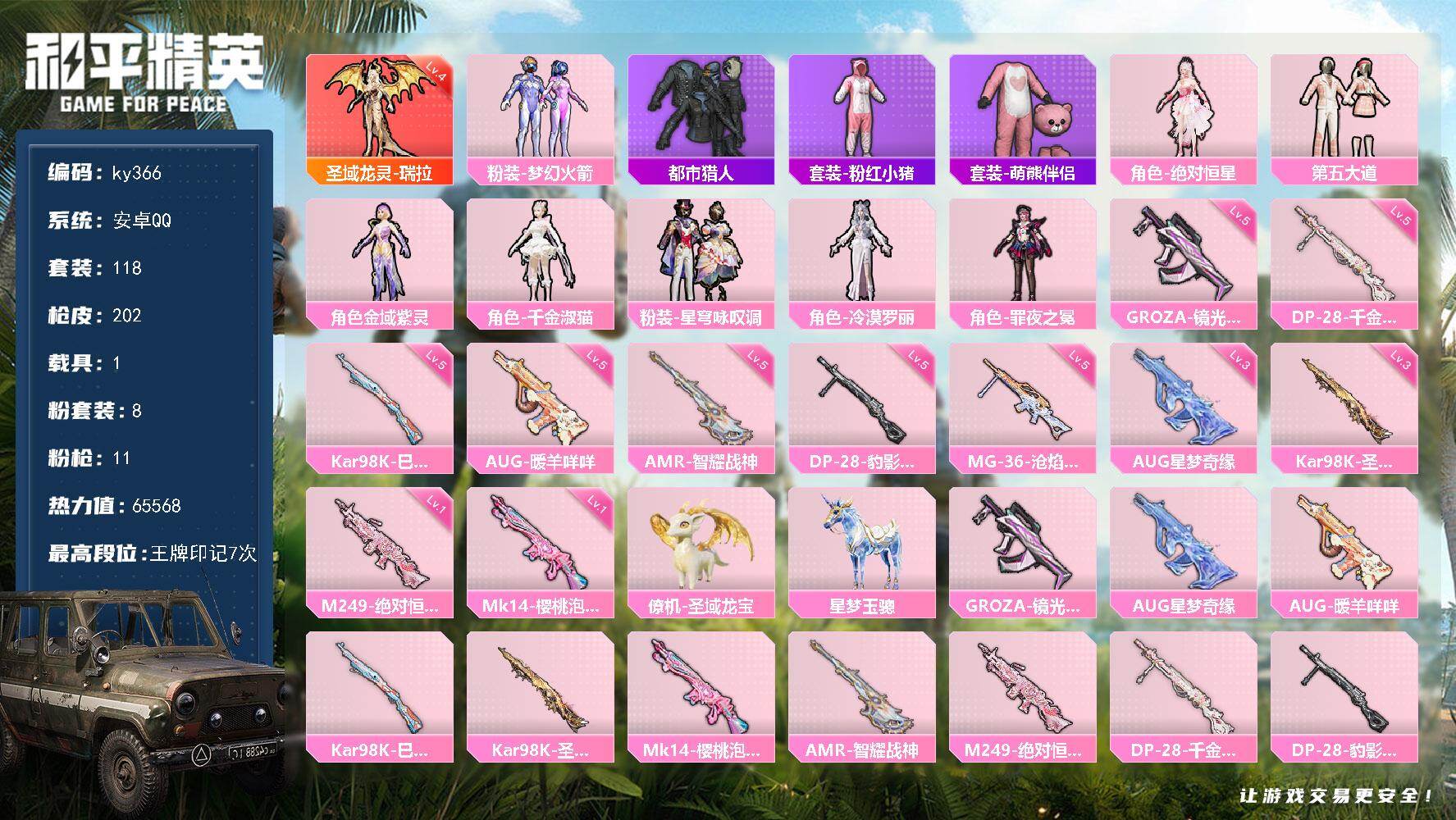 [17013535]安卓 手Q-1神装-8粉装-11特效枪-1载具-6粉色飞行器-65568热力值-7王牌印记-118套装-202枪皮