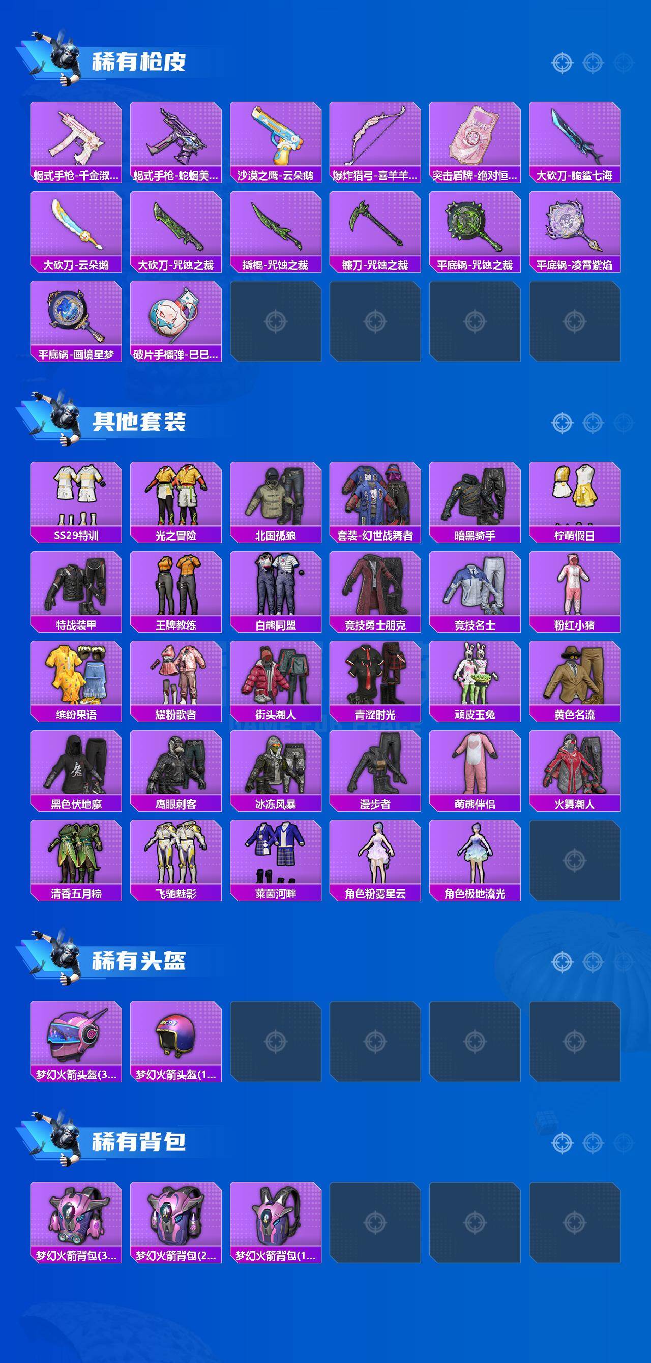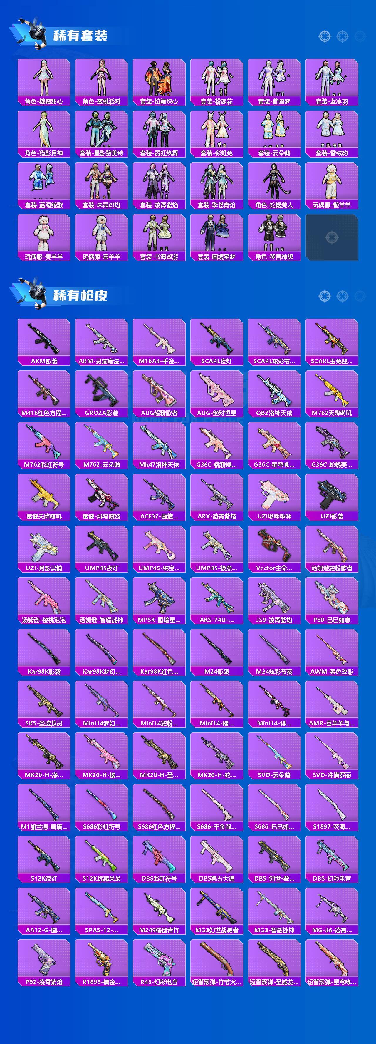 GROZA-镜光银凌,AUG-星梦奇缘,AUG-暖羊咩咩,Kar98K-巳巳如意,Kar98K-圣域龙灵,Mk14-樱桃泡泡,DP-28-千金淑猫