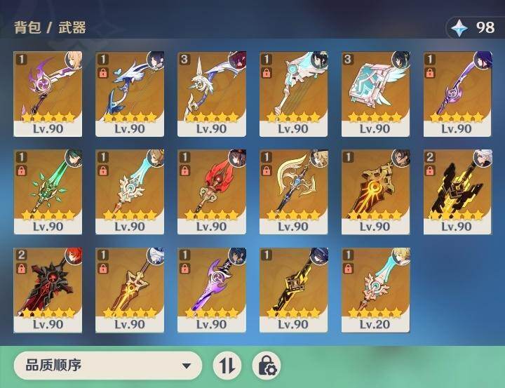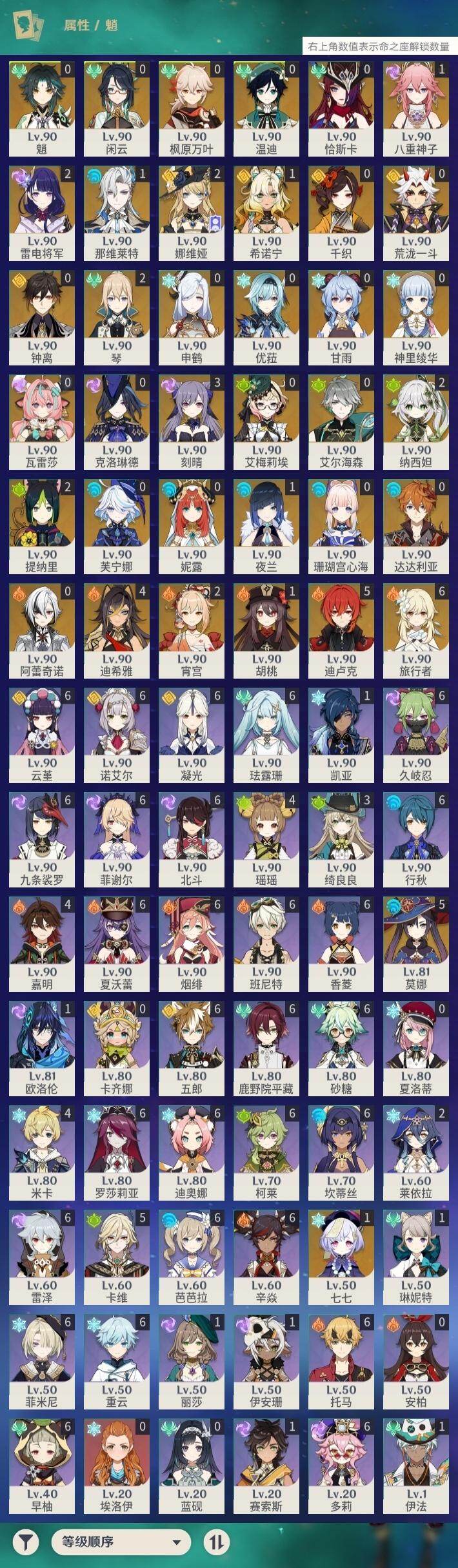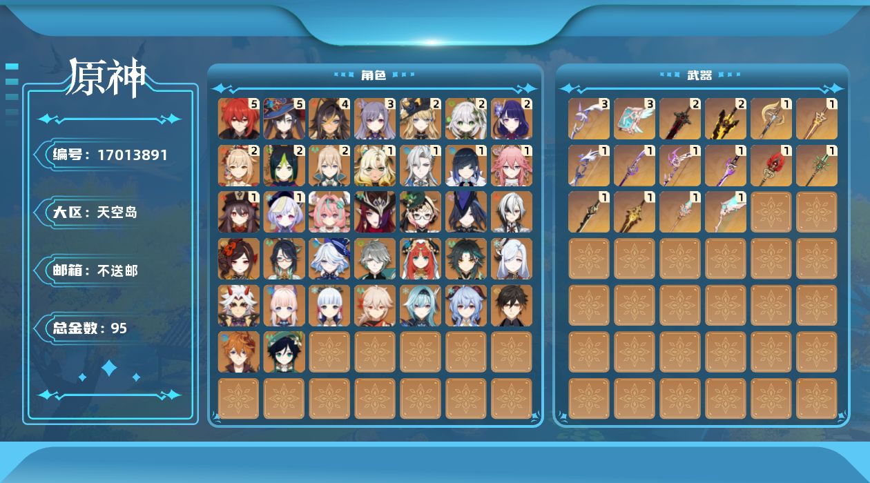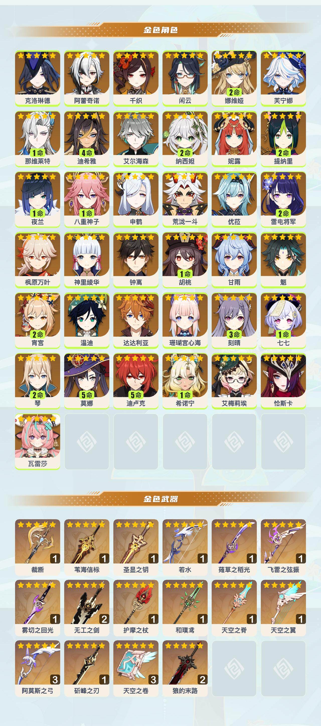 0命克洛琳德,0命阿蕾奇诺,0命千织,0命闲云,2命娜维娅,0命芙宁娜,1命那维莱特,4命迪希雅,0命艾尔海森,2命纳西妲,0命妮露,2命提纳里,1命夜兰,1命八重神子,0命申鹤,0命荒泷一斗,0命优菈,2命雷电将军,0命枫原万叶,0命神里绫华,0命钟离,1命胡桃,0命甘雨,0命魈,2命宵宫,0命温迪,0命达达利亚,0命珊瑚宫心海,3命刻晴,1命七七,2命琴,5命莫娜,5命迪卢克,1命希诺宁,0命艾梅莉埃,0命恰斯卡,0命瓦雷莎,精1裁断,精1苇海信标,精1圣显之钥,精1若水,精1薙草之稻光,精1飞雷之弦振,精1雾切之回光,精2无工之剑,精1护摩之杖,精1和璞鸢,精1天空之脊,精1天空之翼,精3阿莫斯之弓,精1斫峰之刃,精3天空之卷,精2狼的末路