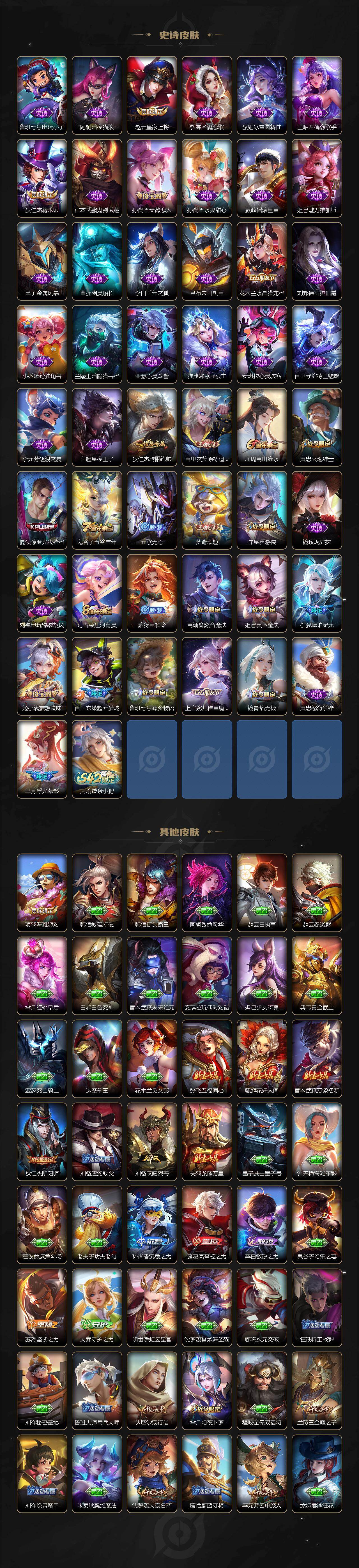 【史诗皮肤】:鲁班七号电玩小子,阿轲暗夜猫娘,赵云皇家上将,貂蝉圣诞恋歌,甄姬冰雪圆舞曲,王昭君偶像歌手,狄仁杰魔术师,宫本武藏鬼剑武藏,孙尚香蔷薇恋人,孙尚香水果甜心,嬴政摇滚巨星,妲己魅力维加斯,墨子金属风暴,曹操幽灵船长,李白千年之狐,吕布末日机甲,花木兰水晶猎龙者,刘邦德古拉伯爵,小乔缤纷独角兽,兰陵王暗隐猎兽者,亚瑟心灵战警,雅典娜冰冠公主,安琪拉心灵骇客,百里守约特工魅影,李元芳逐浪之夏,白起星夜王子,狄仁杰鹰眼统帅,百里玄策原初追逐者,庄周高山流水,黄忠火炮绅士,夏侯惇匿光决锋者,鬼谷子五谷丰年,元歌无心,梦奇顽趣,暃星界游侠,镜玫瑰异探,刘禅电