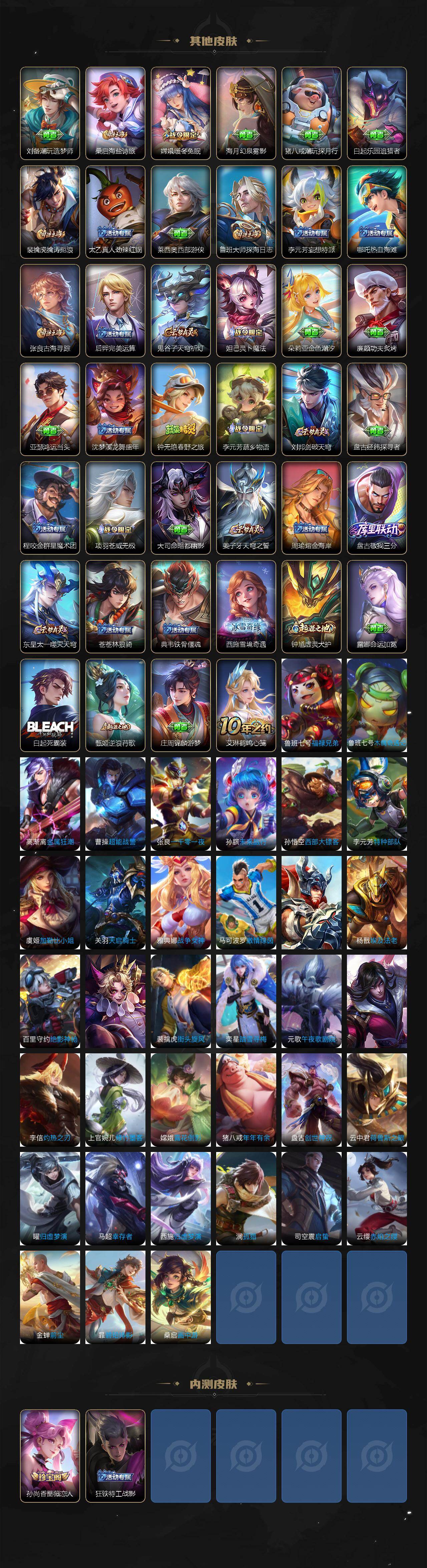 【赛季限定】:达摩沙漠行僧,兰陵王金庭之子,沈梦溪大漠名商,李元芳云中旅人,桑启海盐诗旅,裴擒虎擒涛扼浪,鲁班大师探海日志,张良古海寻踪,鬼谷子天穹祈灯,刘邦剑破天穹,姜子牙天穹之誓,东皇太一噬灭天穹,钟馗虚灵犬护,甄姬逆浪荇歌,百里玄策原初追逐者,梦奇顽趣