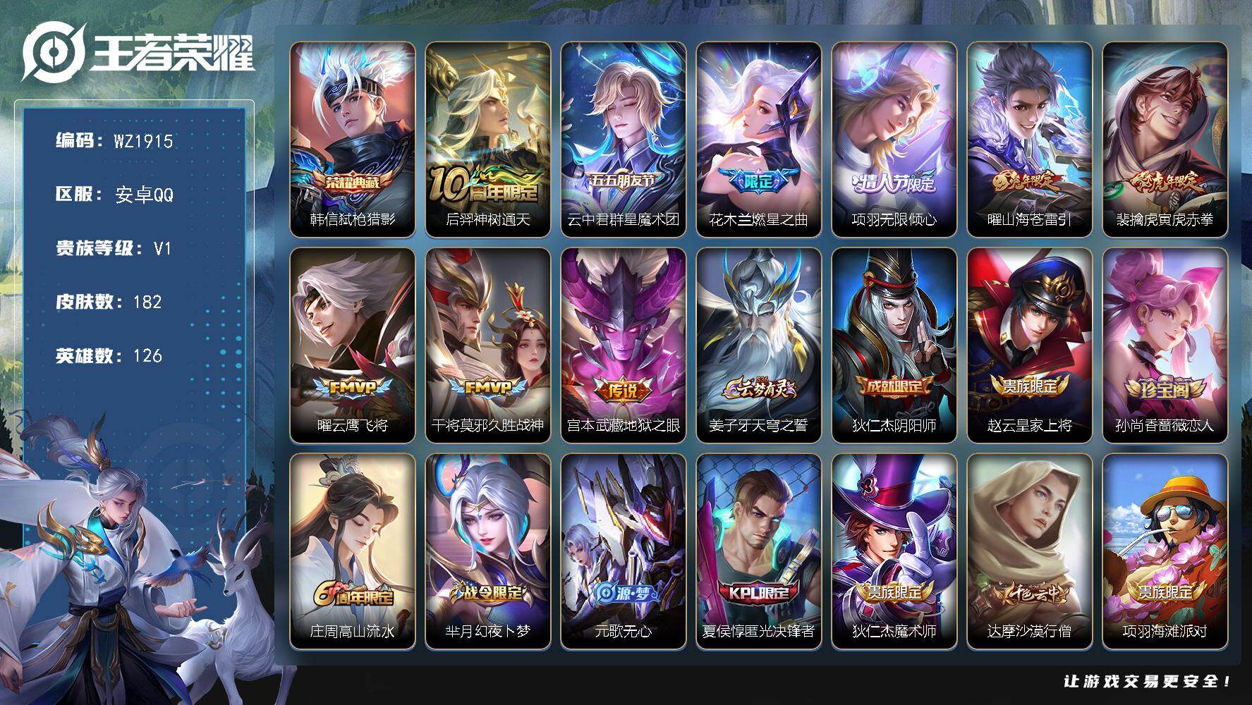 - [11251758]V7 2典藏 5传说 125英雄 279皮肤 可修改实名 女号 荣耀水晶:鸣剑·曳影,九霄神辉(木兰典藏) 传说皮:黄金狮子座,仲夏夜之梦(大飞蛾),炽阳神光,山海·苍雷引(电光曜子) 珍宝阁皮:万物之道,优雅恋人,蔷薇恋人 限定皮:至尊宝,傲雪梅枪,时雨天司(水龙头),神威(电光马子),遇见飞天,高山流水,五谷丰年,游园惊梦,梁祝,李小龙,默契交锋-花木兰,冰霜恋舞曲,蜜橘之夏,匿光追影者,时之祈愿-云中君,百木心枪 史诗皮:蒙犽顽岩魄,破空之剑,紫霞仙子,电玩小子(小书包),黄金分割率,特工魅影,千年之狐,永昼,江河有灵,高渐离燃音魔法,百解令(蒙犽),蒙恬荣光圣徽,冰冠公主,偶像歌手,晚萤,魅语,电玩·爆裂旋风,末日机甲-吕布,猫狗日记-孙策,猫狗日记-大乔,时之恋人-孙尚香,乱世虎臣,节奏热浪,修罗,女仆咖啡,摇滚巨星,水果甜心,天才门将,星夜王子,心灵骇客,功夫厨神,德古拉伯爵,暗隐猎兽者,幽灵船长,鬼剑武藏,暗渊魔法,心灵战警,舞动绿茵,地狱岩魂,纤云弄巧,繁星吟游(呼啦呼啦),拒霜思,缤纷独角兽,乘风破浪,逐浪之夏,水晶猎龙者,曙光守护者,箭羽风息,金属风暴,原初追逐者,圣诞狂欢,圣诞恋歌,鹰眼统帅,魅力维加斯,黎明之约,赏金猎手,无心,未来纪元-赵云