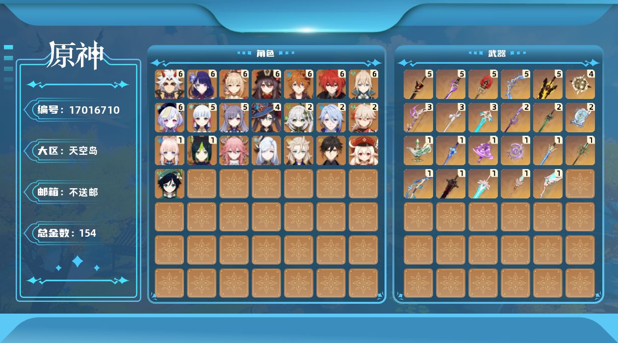 2命纳西妲,1命提纳里,2命神里绫人,0命八重神子,0命申鹤,满命荒泷一斗,满命雷电将军,2命枫原万叶,5命神里绫华,0命钟离,满命胡桃,满命宵宫,0命温迪,0命可莉,满命达达利亚,0命阿贝多,1命珊瑚宫心海,5命刻晴,满命七七,满命琴,4命莫娜,满命迪卢克,0命哥伦比娅,精1千夜浮梦,精1波乱月白经津,精1神乐之真意,精5赤角石溃杵,精1终末嗟叹之诗,精5冬极白星,精1不灭月华,精2薙草之稻光,精3飞雷之弦振,精5雾切之回光,精1苍古自由之誓,精5无工之剑,精5护摩之杖,精2磐岩结绿,精2四风原典,精1和璞鸢,精1天空之脊,精1天空之翼,精3天空之刃,精4尘世之锁,精3风鹰剑,精1狼的末路,精1天空之傲