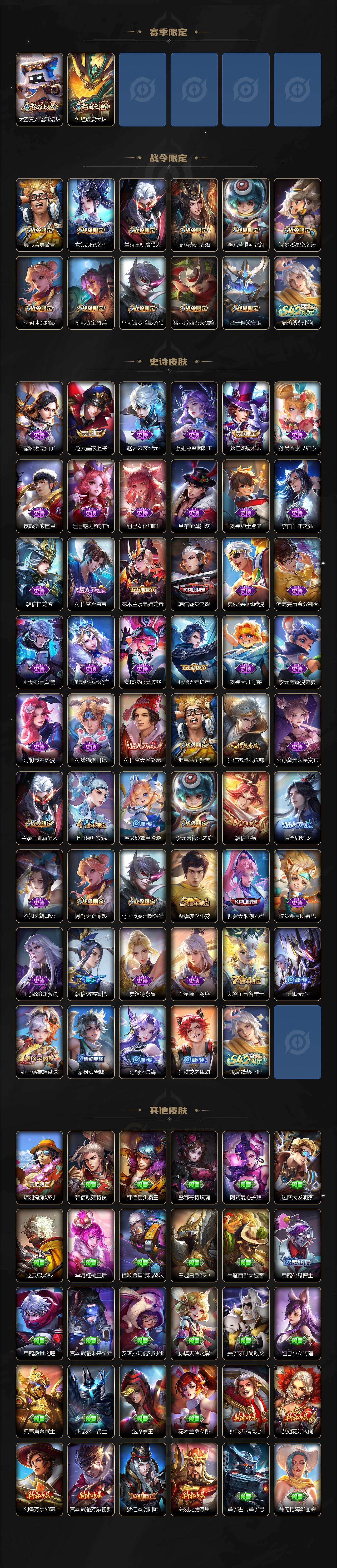 【赛季限定】:狂铁御狮,米莱狄御霄,牛魔御旌,盾山御銮,夏侯惇朔风刀,弈星混沌棋,明世隐疑决卦,老夫子醍醐杖,鬼谷子原初探秘者,狄仁杰万华元夜,程咬金演武夺筹,钟馗驱傩正仪,苏烈千军破阵,达摩沙漠行僧,兰陵王金庭之子,沈梦溪大漠名商,李元芳云中旅人,桑启海盐诗旅,裴擒虎擒涛扼浪,鲁班大师探海日志,鬼谷子天穹祈灯,刘邦剑破天穹,姜子牙天穹之誓,东皇太一噬灭天穹,太乙真人谧流熔炉,钟馗虚灵犬护