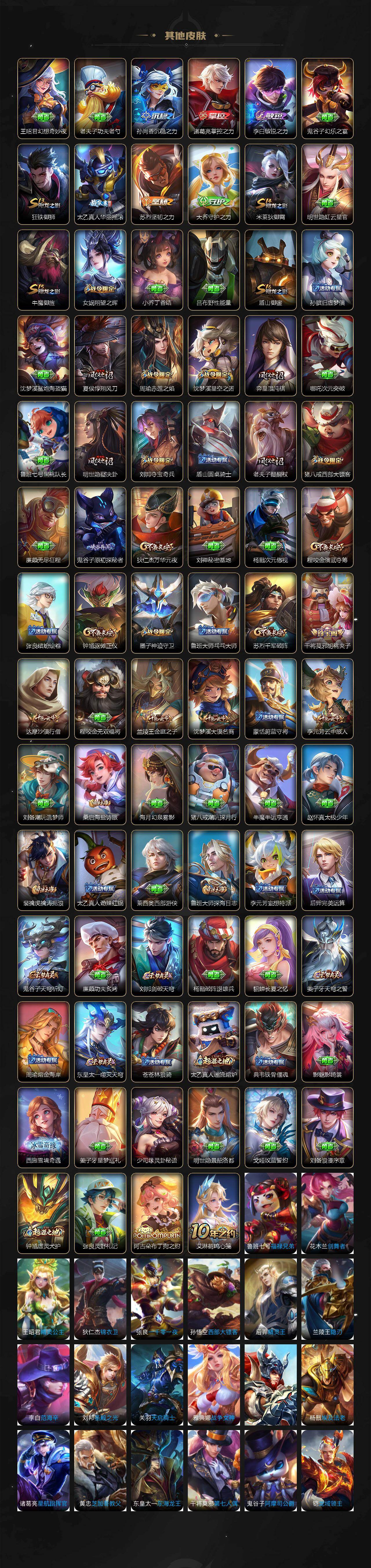 【限定皮肤】:蒙犽顽岩魄,姜子牙天穹之誓,杨戬破阵退雄兵,狄仁杰阴阳师,赵云皇家上将,墨子神迹守卫,阿轲迷踪丽影,周瑜赤莲之焰,元歌无心,夏侯惇朔风刀,典韦蓝屏警告,马可波罗暗影游猎,狄仁杰魔术师,狄仁杰万华元夜,达摩沙漠行僧,项羽海滩派对,老夫子醍醐杖,程咬金演武夺筹,刘邦夺宝奇兵,韩信逐梦之影,韩信飞衡,韩信傲雪梅枪,兰陵王驯魔猎人,兰陵王金庭之子,孙悟空至尊宝,孙悟空大圣娶亲,牛魔御旌,后羿如梦令,李元芳银河之约,李元芳云中旅人,钟馗驱傩正仪,女娲朔望之晖,干将莫邪胡桃夹子,蔡文姬繁星吟游,太乙真人华丽摇滚,鬼谷子原初探秘者,鬼谷子五谷丰年,苏烈千军破阵,弈星混沌棋,沈梦溪星空之诺,沈梦溪大漠名商,明世隐疑决卦,裴擒虎李小龙,裴擒虎擒涛扼浪,狂铁御狮,米莱狄御霄,伽罗天狼溯光者,盾山御銮,猪八戒西部大镖客,上官婉儿梁祝,曜李逍遥 ,鲁班大师探海日志,桑启海盐诗旅,鬼谷子天穹祈灯,姬小满妄想食味,刘邦剑破天穹,周瑜熔金海岸