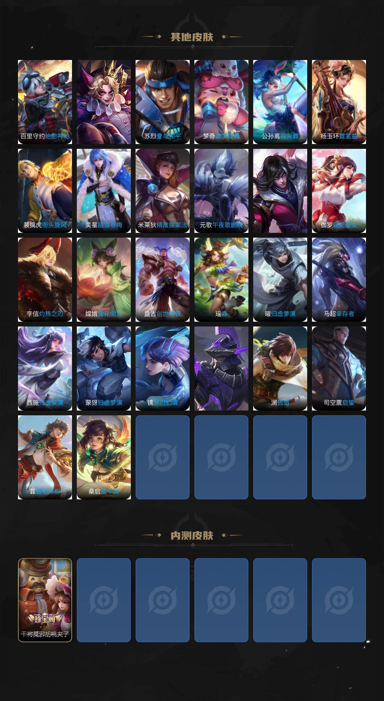 狂铁御狮,米莱狄御霄,牛魔御旌,盾山御銮,夏侯惇朔风刀,明世隐疑决卦,老夫子醍醐杖,鬼谷子原初探秘者,狄仁杰万华元夜,程咬金演武夺筹,钟馗驱傩正仪,苏烈千军破阵,女娲朔望之晖,典韦蓝屏警告,沈梦溪星空之诺,李元芳银河之约,刘邦夺宝奇兵,马可波罗暗影游猎,弈星混沌棋,达摩沙漠行僧,兰陵王金庭之子,沈梦溪大漠名商,李元芳云中旅人,桑启海盐诗旅,裴擒虎擒涛扼浪,鲁班大师探海日志