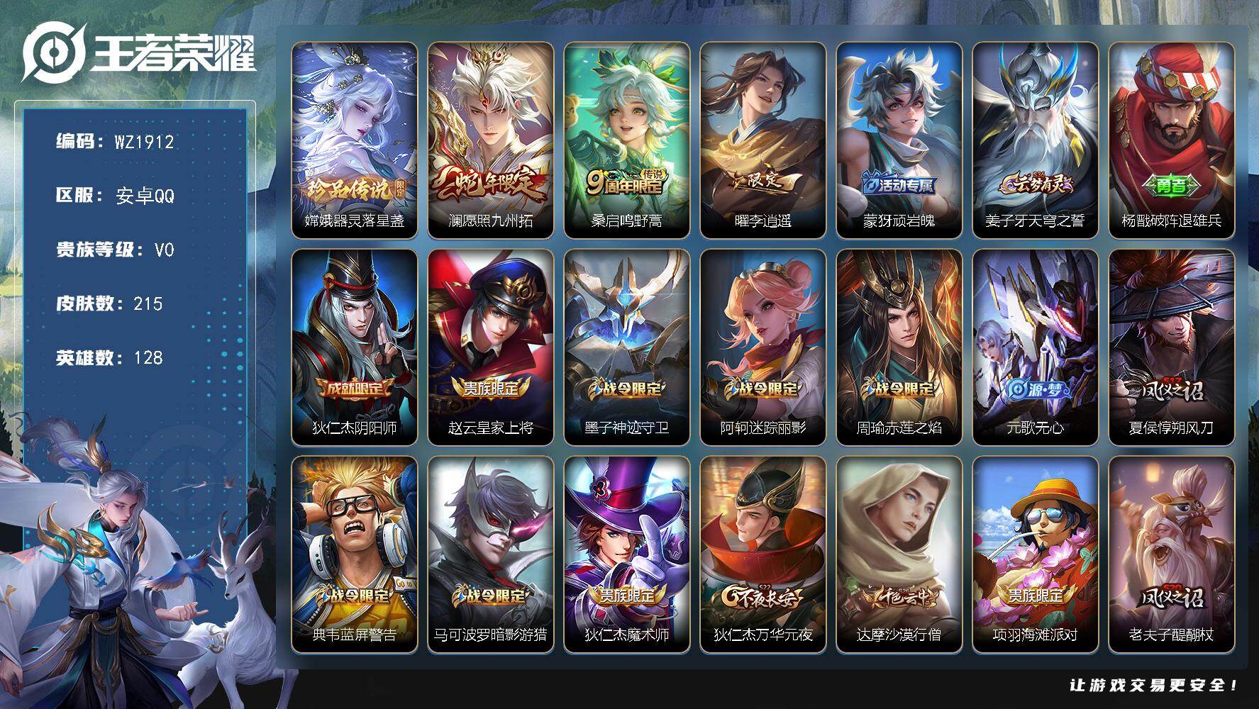 [17016792]安卓Q-215皮肤-1珍品传说-3传说-52史诗 【英雄全皮】:影全皮 【珍品传说】:嫦娥器灵落星盏 【传说皮肤】:澜愿照九州拓,桑启鸣野蒿,曜李逍遥 【限定皮肤】:蒙犽顽岩魄,姜子牙天穹之誓,杨戬破阵退雄兵,狄仁杰阴阳师,赵云皇家上将,墨子神迹守卫,阿轲迷踪丽影,周瑜赤莲之焰,元歌无心,夏侯惇朔风刀,典韦蓝屏警告,马可波罗暗影游猎,狄仁杰魔术师,狄仁杰万华元夜,达摩沙漠行僧,项羽海滩派对,老夫子醍醐杖,程咬金演武夺筹,刘邦夺宝奇兵,韩信逐梦之影,韩信飞衡,韩信傲雪梅枪,兰陵王驯魔猎人,兰陵王金庭之子,孙悟空至尊宝,孙悟空大圣娶亲,牛魔御旌,后羿如梦令,李元芳银河之约,李元芳云中旅人,钟馗驱傩正仪,女娲朔望之晖,干将莫邪胡桃夹子,蔡文姬繁星吟游,太乙真人华丽摇滚,鬼谷子原初探秘者,鬼谷子五谷丰年,苏烈千军破阵,弈星混沌棋,沈梦溪星空之诺,沈梦溪大漠名商,明世隐疑决卦,裴擒虎李小龙,裴擒虎擒涛扼浪,狂铁御狮,米莱狄御霄,伽罗天狼溯光者,盾山御銮,猪八戒西部大镖客,上官婉儿梁祝,曜李逍遥 ,鲁班大师探海日志,桑启海盐诗旅,鬼谷子天穹祈灯,姬小满妄想食味,刘邦剑破天穹,周瑜熔金海岸 【年限皮肤】:韩信飞衡,澜愿照九州拓 【赛季限定】:狂铁御狮,米莱狄御霄,牛魔御旌,盾山御銮,夏侯惇朔风刀,弈星混沌棋,明世隐疑决卦,老夫子醍醐杖,鬼谷子原初探秘者,狄仁杰万华元夜,程咬金演武夺筹,钟馗驱傩正仪,苏烈千军破阵,达摩沙漠行僧,兰陵王金庭之子,沈梦溪大漠名商,李元芳云中旅人,桑启海盐诗旅,裴擒虎擒涛扼浪,鲁班大师探海日志,鬼谷子天穹祈灯,刘邦剑破天穹,姜子牙天穹之誓,东皇太一噬灭天穹,太乙真人谧流熔炉,钟馗虚灵犬护 【战令限定】:典韦蓝屏警告,女娲朔望之晖,兰陵王驯魔猎人,周瑜赤莲之焰,李元芳银河之约,沈梦溪星空之诺,阿轲迷踪丽影,刘邦夺宝奇兵,马可波罗暗影游猎,猪八戒西部大镖客,墨子神迹守卫,周瑜线条小狗 【史诗皮肤】:露娜紫霞仙子,赵云皇家上将,赵云未来纪元,甄姬冰雪圆舞曲,狄仁杰魔术师,孙尚香水果甜心,嬴政摇滚巨星,妲己魅力维加斯,妲己女仆咖啡,吕布圣诞狂欢,刘禅绅士熊喵,李白千年之狐,韩信白龙吟,孙悟空至尊宝,花木兰水晶猎龙者,韩信逐梦之影,夏侯惇乘风破浪,诸葛亮黄金分割率,亚瑟心灵战警,雅典娜冰冠公主,安琪拉心灵骇客,铠曙光守护者,刘禅天才门将,李元芳逐浪之夏,阿轲节