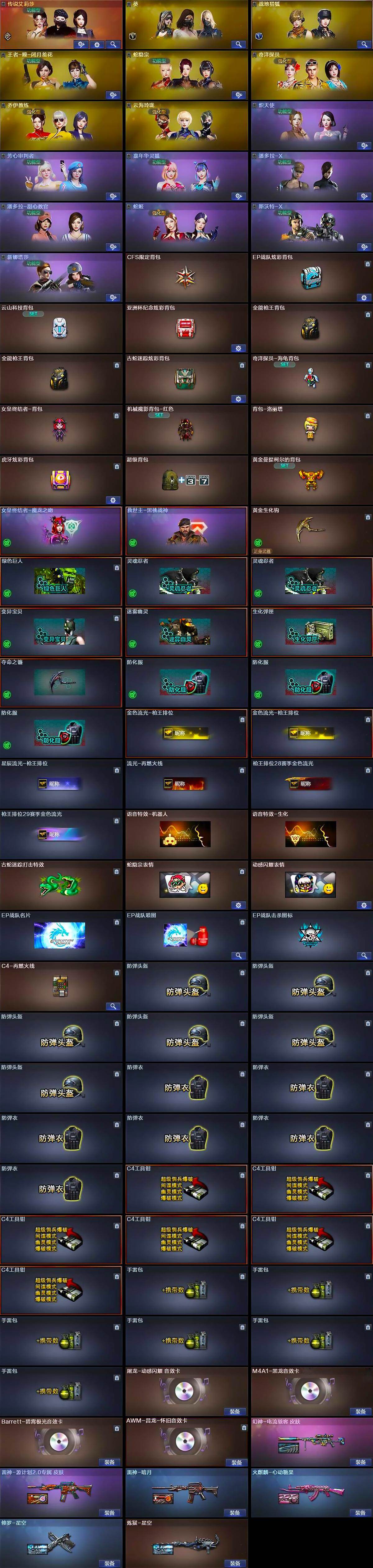 【道具】:CFS限定背包,EP战队炫彩背包,云山科技背包,亚洲杯纪念炫彩背包,全能枪王背包*2,古蛇迷踪炫彩背包,奇洋探员-海龟背包,女皇终结者-背包,机械魔影背包-红色,背包-洛丽塔,虎牙炫彩背包,超级背包,黄金曼提柯尔的背包,女皇终结者-魔龙之吻,救世主-黑桃战神,黄金生化钩,绿色巨人,灵魂忍者*2,变异宝贝,迷雾幽灵,生化弹匣,夺命之镰,防化服*3,金色流光-枪王排位*2,星辰流光-枪王排位,流光-再燃火线,枪王排位28赛季金色流光,枪王排位29赛季金色流光,语音特效-机器人,语音特效-生化,古蛇迷踪打击特效,蛇隐宗表情,动感闪耀表情,EP战队名片,EP战队喷图,EP战队击杀图标,C4-再燃火线,防弹头盔*6,防弹衣*6,C4工具钳*6,手雷包*6