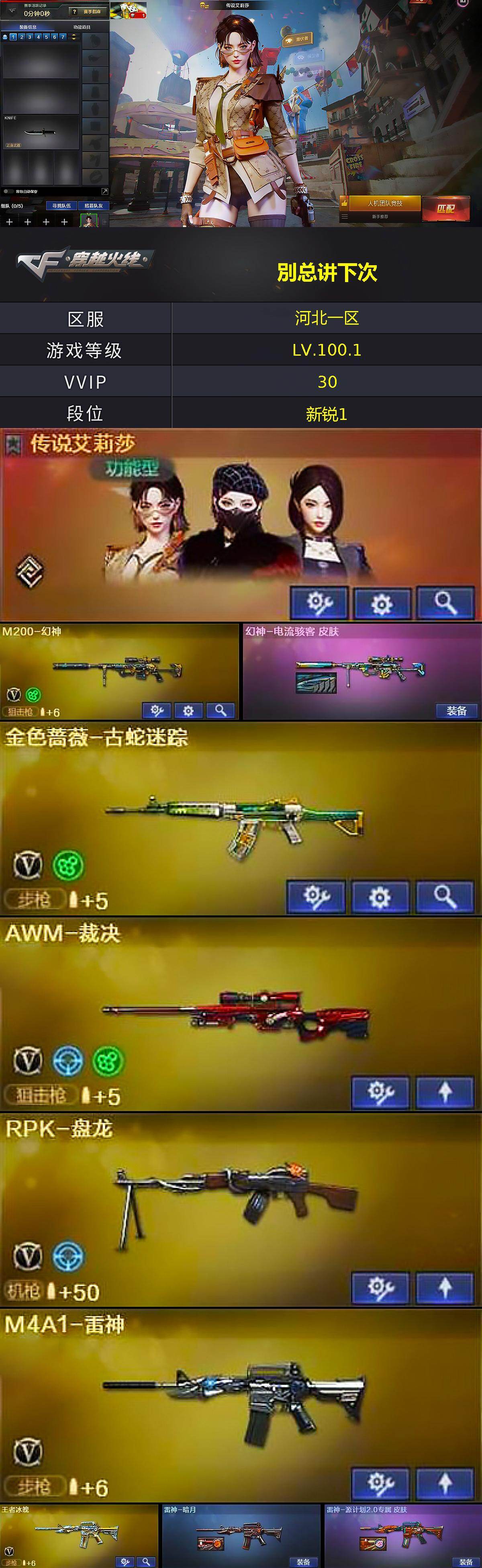 [17017006]河北一区-28V-3王者武器数-0炫金武器数 【传说角色】:传说艾莉莎 【热门武器】:M200-幻神,金色蔷薇-古蛇迷踪,修罗-古蛇迷踪,RPK-盘龙,加特林-炼狱,金色蔷薇-空 【音效卡】:屠龙-动感闪耀 音效卡,M4A1-黑龙音效卡,Barrett-碧霄极光音效卡,AWM-昌龙-怀旧音效卡 【皮肤】:幻神-电流骇客 皮肤,雷神-暗月,雷神-源计划2.0专属 皮肤,火麒麟-心动糖果,炼狱-星空,修罗-星空 【角色】:葵,战地猎狐,王者-瞳-闭月羞花,蛇隐宗,奇洋探员,乔伊教练,云海玲珑,炽天使,芳心审判者,嘉年华灵狐,潘多拉-X,潘多拉-甜心教官,蛇姬,斯沃特-X,新娜塔莎 【人偶武器】:金色蔷薇-空,迷你深渊冰龙,迷你裂空之翼,迷你波特博士,生化手雷-机甲核心*3 【暴走生化】:超级对讲机 【挑战大师】:冰龙粉碎者-白马银枪*2,神圣爆裂者-末日III 【英雄级武器】:M4A1-黑龙,M4A1-雷神,金色蔷薇-古蛇迷踪,QBZ03-独角-III,烈火-动感闪耀,超新星-悦享-觉醒版,王者冰魄-觉醒版,黑骑士-海王,AWM-天龙,AWM-裁决,M200-幻神,RPK-盘龙,加特林-炼狱,天神-动感闪耀,修罗-古蛇迷踪,麒麟刺,唐刀-神工天巧,屠龙-动感闪耀,高爆手雷-神工天巧*2,手雷-动感闪耀,高爆手雷-古蛇迷踪,高爆手雷-玄豹,闪光弹-神工天巧,烟雾弹-神工天巧,烟雾弹-古蛇迷踪,M4A1-赤狱骑士,Barrett-碧霄极光 【道具】:CFS限定背包,EP战队炫彩背包,云山科技背包,亚洲杯纪念炫彩背包,全能枪王背包*2,古蛇迷踪炫彩背包,奇洋探员-海龟背包,女皇终结者-背包,机械魔影背包-红色,背包-洛丽塔,虎牙炫彩背包,超级背包,黄金曼提柯尔的背包,女皇终结者-魔龙之吻,救世主-黑桃战神,黄金生化钩,绿色巨人,灵魂忍者*2,变异宝贝,迷雾幽灵,生化弹匣,夺命之镰,防化服*3,金色流光-枪王排位*2,星辰流光-枪王排位,流光-再燃火线,枪王排位28赛季金色流光,枪王排位29赛季金色流光,语音特效-机器人,语音特效-生化,古蛇迷踪打击特效,蛇隐宗表情,动感闪耀表情,EP战队名片,EP战队喷图,EP战队击杀图标,C4-再燃火线,防弹头盔*6,防弹衣*6,C4工具钳*6,手雷包*6 【特殊枪械】:1盘龙,1炼狱