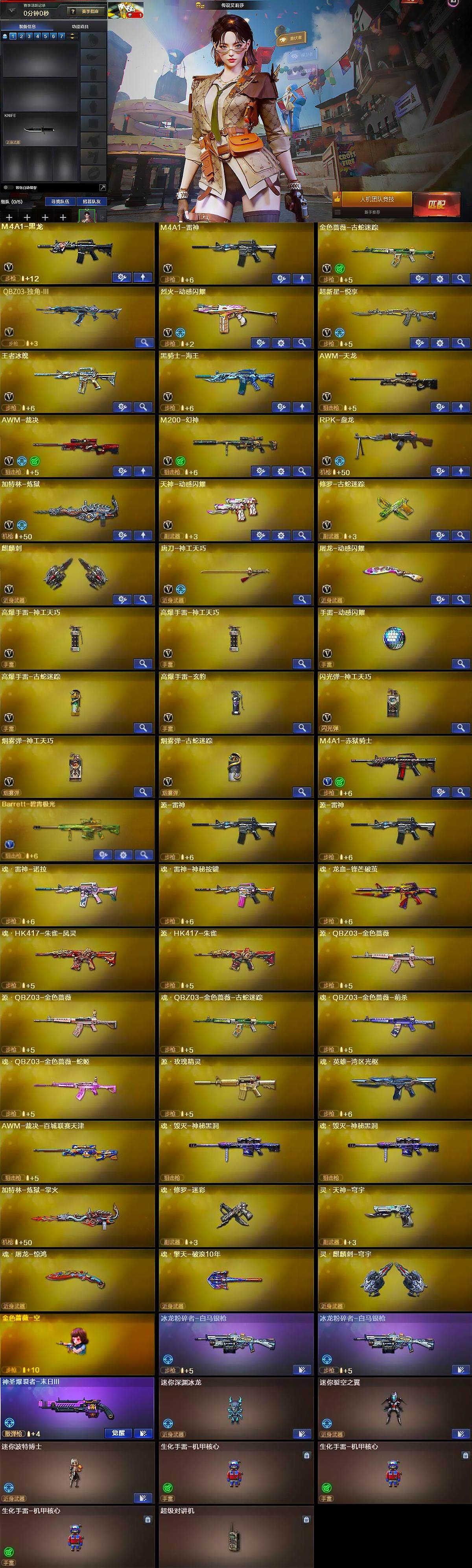【英雄级武器】:M4A1-黑龙,M4A1-雷神,金色蔷薇-古蛇迷踪,QBZ03-独角-III,烈火-动感闪耀,超新星-悦享-觉醒版,王者冰魄-觉醒版,黑骑士-海王,AWM-天龙,AWM-裁决,M200-幻神,RPK-盘龙,加特林-炼狱,天神-动感闪耀,修罗-古蛇迷踪,麒麟刺,唐刀-神工天巧,屠龙-动感闪耀,高爆手雷-神工天巧*2,手雷-动感闪耀,高爆手雷-古蛇迷踪,高爆手雷-玄豹,闪光弹-神工天巧,烟雾弹-神工天巧,烟雾弹-古蛇迷踪,M4A1-赤狱骑士,Barrett-碧霄极光