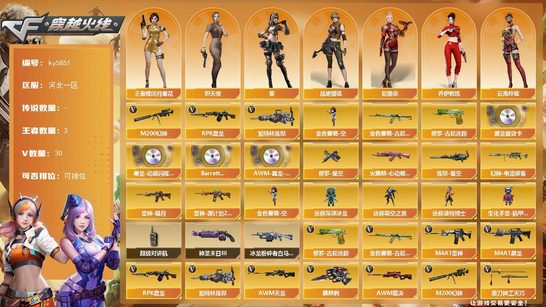 - [15344182]四川一区-33V-2王者-0炫金 【传说武器】:传说幽瞳 【热门武器】:传说幽瞳,QBZ03-金色蔷薇,M200-幻神*2,炽芒蝶刃 【音效卡】:M4A1-雷神音效卡 【皮肤】:幻神-CFS2022,金色蔷薇-Heartshot皮肤,金色蔷薇-破浪逐光 皮肤,雷神-暗月,雷神-杨戬,雷神-源计划2.0专属 皮肤,火麒麟-雷神,火麒麟-白虎,毁灭-暗月,毁灭-秦师 皮肤,黑龙-能量核心,黑龙-墨子皮肤,黑骑士-破浪10年皮肤,屠龙-破浪逐光 皮肤 【角色】:电竞教官-云悠悠,雨墨,王者零-华冠丽服,王者凌霄,王者晴雅,奇洋探员,乔伊教练,云海玲珑,暗夜-X,北极狐-X,初恋灵狐,电竞少女,飞虎队-X,娟娟,灵狐者-职业经理,麻雀,曼陀罗-X,潘多拉-X,潘多拉-甜心教官,潜龙队-X,青霞仙子,新娜塔莎,夜玫瑰-宠粉,游珑儿 【人偶武器】:火麒麟-灵狐,Scar Light-马枪,沙鹰-夜玫瑰 【英雄级武器】:AK47-火麒麟,M4A1-雷神*2,黑武士-锦绣游龙,超新星-热带奇洋,QBZ03-独角-III,QBZ03-金色蔷薇,王者白虎-觉醒版,Barrett-毁灭,M200-幻神*2,VSK-94-金蚀,烈龙-云海游龙,沙鹰-天神*2,柯尔特-无冕之王,屠龙,幻灵之锋,炽芒蝶刃,擎天-云海游龙,龙啸-热带奇洋,高爆手雷-幻灵,高爆手雷-竞技荣光,手雷-云海游龙,手雷-热带奇洋,闪光弹-幻灵*2,闪光弹-竞技荣光,烟雾弹-幻灵,烟雾弹-竞技荣光 【道具】:BS战队炫彩背包,CFS限定背包,云山科技背包,云海游龙炫彩背包,奇洋探员-海龟背包,女皇终结者-背包,热带奇洋炫彩背包,超级背包,女皇终结者-魔龙之吻,绿色巨人,灵魂忍者,迷雾幽灵,生化弹匣,夺命之镰,防化服*3,金色流光-枪王排位,星辰流光-枪王排位,枪王排位28赛季金色流光,语音特效-机器人,电玩兔兔表情,热带奇洋表情,云海游龙表情,防弹头盔*3,防弹衣*3,C4工具钳*3,手雷包*3 【特殊枪械】: