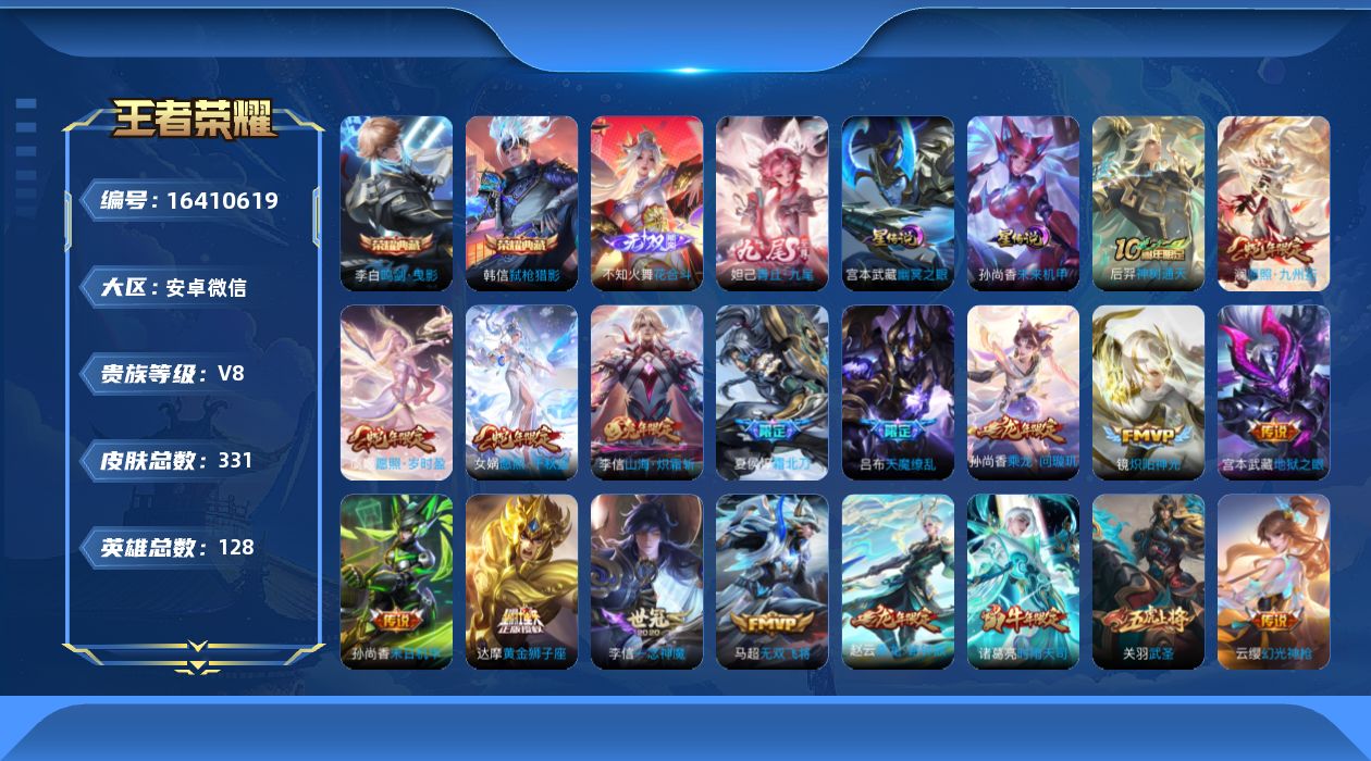 [16410619]安卓WX-V8-至尊星耀V段位-128英雄-331皮肤-2典藏皮肤-2无双-26传说-108史诗-v9差2179