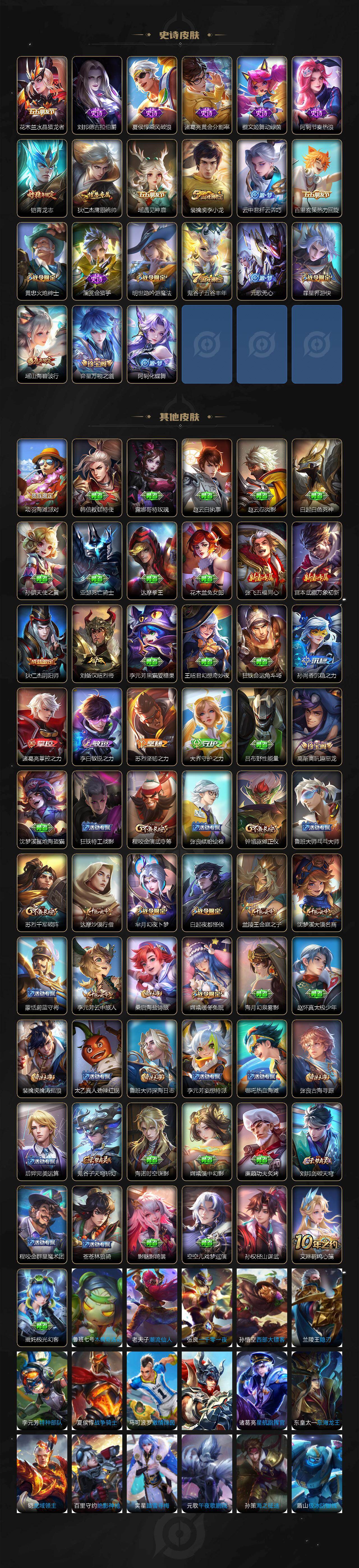 【史诗皮肤】:赵云皇家上将,赵云未来纪元,甄姬冰雪圆舞曲,狄仁杰魔术师,宫本武藏鬼剑武藏,孙尚香水果甜心,嬴政摇滚巨星,妲己魅力维加斯,妲己女仆咖啡,墨子金属风暴,吕布圣诞狂欢,吕布末日机甲,花木兰水晶猎龙者,刘邦德古拉伯爵,夏侯惇乘风破浪,诸葛亮黄金分割率,蔡文姬舞动绿茵,阿轲节奏热浪,铠青龙志,狄仁杰鹰眼统帅,瑶遇见神鹿,裴擒虎李小龙,云中君纤云弄巧,百里玄策热力回旋,黄忠火炮绅士,澜赏金猎手,明世隐吟游魔法,鬼谷子五谷丰年,元歌无心,暃星界游侠,瑶山海碧波行,弈星万物之道,阿轲化蝶舞