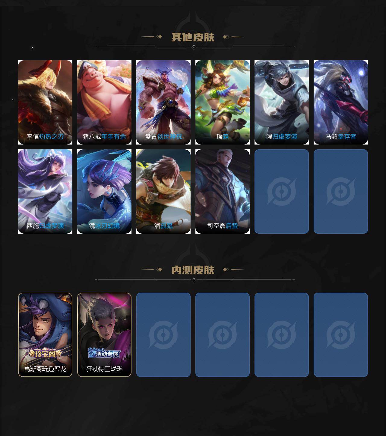 【赛季限定】:程咬金演武夺筹,钟馗驱傩正仪,苏烈千军破阵,达摩沙漠行僧,兰陵王金庭之子,沈梦溪大漠名商,李元芳云中旅人,桑启海盐诗旅,裴擒虎擒涛扼浪,鲁班大师探海日志,张良古海寻踪,鬼谷子天穹祈灯,刘邦剑破天穹