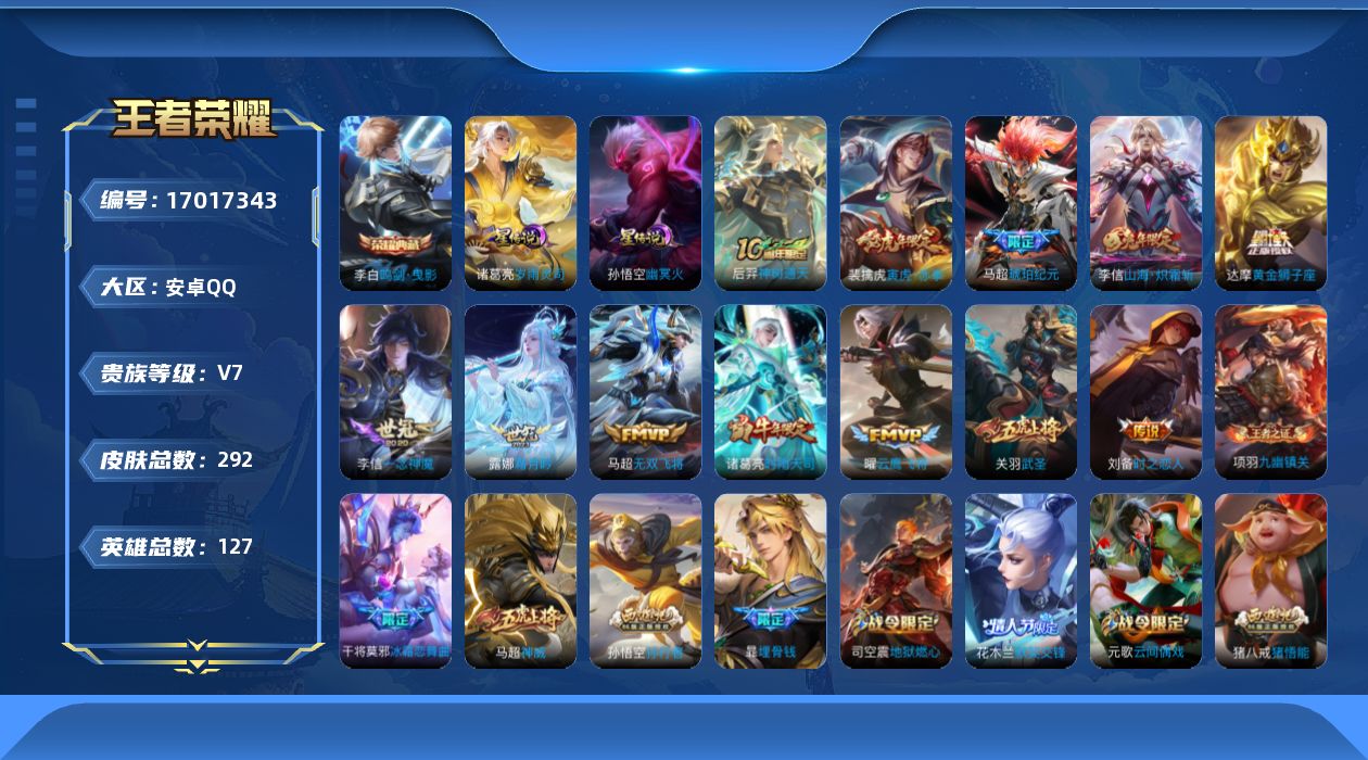 - [12194738]V7 1典藏 1珍品传说 10传说 124英雄 303皮肤 可修改实名 优质装备:星域神启(倪克斯贼亮),器灵·落星盏,黄金白羊座,仲夏夜之梦(大飞蛾),山海·炽霜斩(李信年限),涂山容容 传说皮:幻光神枪 珍宝阁皮:胡桃夹子,万物之道,女武神 限定皮:鸣野蒿,至尊宝,白虎志(电光耗子),凤求凰(白切鸡),梅西,武陵仙君(小桃花),时之彼端,神威(电光马子),飞衡(韩信年限),遇见飞天,五谷丰年,武圣,梁祝,祈雪灵祝(雪兔子),天狼绘梦者,李小龙,朱雀志(守约年限),如梦令-嫦娥,默契交锋-花木兰,猪悟能,一生所爱,大圣娶亲,青春决赛季 史诗皮:星界战将,龙之律动,百相守梦-周瑜,琥珀纪元伽罗,百相守梦-黄忠,织梦人,苍穹之光,黄金分割率,永昼,江河有灵,蒙恬荣光圣徽,无限星赏官,冰冠公主,晚萤,电玩·爆裂旋风,龙骑士(小龙虾),末日机甲-吕布,猫狗日记-孙策,时之恋人-孙尚香,乱世虎臣,节奏热浪,修罗,女仆咖啡,摇滚巨星,水果甜心,绅士熊喵,天才门将,星夜王子,心灵骇客,功夫厨神,德古拉伯爵,暗隐猎兽者,幽灵船长,鬼剑武藏,心灵战警,舞动绿茵,地狱岩魂,纤云弄巧,繁星吟游(呼啦呼啦),拒霜思,缤纷独角兽,乘风破浪,逐浪之夏,月团寄思,水晶猎龙者,曙光守护者,箭羽风息,金属风暴,原初追逐者,圣诞狂欢,圣诞恋歌,鹰眼统帅,王者之锤,暗夜贵公子,魅力维加斯,黎明之约,赏金猎手,无心
