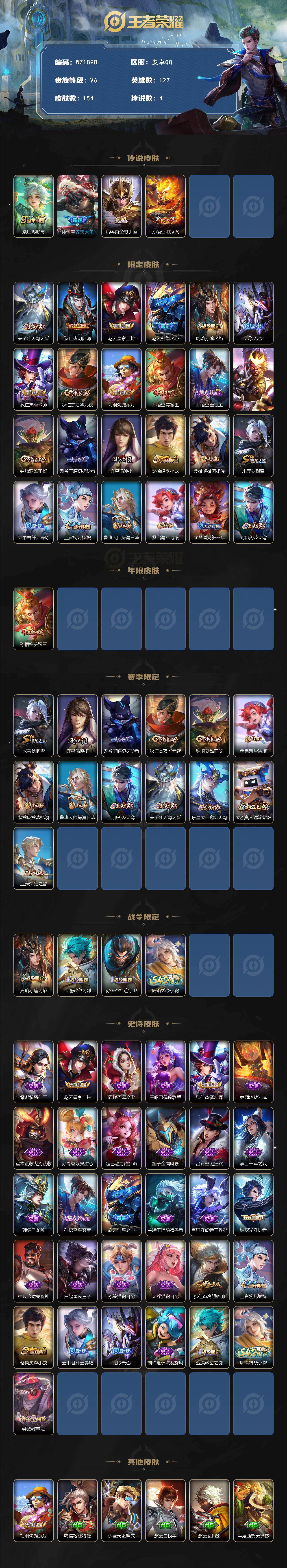 [17017503]安卓Q-154皮肤-4传说-30史诗 【英雄全皮】:影全皮 【传说皮肤】:桑启鸣野蒿,孙悟空齐天大圣,后羿黄金射手座,孙悟空地狱火 【限定皮肤】:姜子牙天穹之誓,狄仁杰阴阳师,赵云皇家上将,赵云引擎之心,周瑜赤莲之焰,元歌无心,狄仁杰魔术师,狄仁杰万华元夜,项羽海滩派对,孙悟空美猴王,孙悟空至尊宝,孙悟空齐天大圣,钟馗驱傩正仪,鬼谷子原初探秘者,弈星混沌棋,裴擒虎李小龙,裴擒虎擒涛扼浪,米莱狄御霄,云中君纤云弄巧,上官婉儿梁祝,鲁班大师探海日志,桑启海盐诗旅,沈梦溪龙舞盛年,刘邦剑破天穹 【年限皮肤】:孙悟空美猴王 【赛季限定】:米莱狄御霄,弈星混沌棋,鬼谷子原初探秘者,狄仁杰万华元夜,钟馗驱傩正仪,桑启海盐诗旅,裴擒虎擒涛扼浪,鲁班大师探海日志,刘邦剑破天穹,姜子牙天穹之誓,东皇太一噬灭天穹,太乙真人谧流熔炉,亚瑟荣光之誓 【战令限定】:周瑜赤莲之焰,亚连破空之剑,孙悟空神迹守卫,周瑜线条小狗 【史诗皮肤】:露娜紫霞仙子,赵云皇家上将,貂蝉圣诞恋歌,王昭君偶像歌手,狄仁杰魔术师,廉颇地狱岩魂,宫本武藏鬼剑武藏,孙尚香水果甜心,妲己魅力维加斯,墨子金属风暴,吕布圣诞狂欢,李白千年之狐,韩信白龙吟,孙悟空至尊宝,赵云引擎之心,兰陵王暗隐猎兽者,百里守约特工魅影,铠曙光守护者,程咬金功夫厨神,白起星夜王子,孙策猫狗日记,大乔猫狗日记,狄仁杰鹰眼统帅,上官婉儿梁祝,裴擒虎李小龙,云中君纤云弄巧,元歌无心,刘禅电玩爆裂旋风,亚连破空之剑,周瑜线条小狗,钟馗锁墨魂 【其他皮肤】:项羽海滩派对,韩信教廷特使,达摩大发明家,赵云白执事,赵云忍炎影,牛魔西部大镖客,扁鹊化身博士,宫本武藏未来纪元,安琪拉玩偶对对碰,孙膑天使之翼,姜子牙时尚教父,妲己少女阿狸,典韦黄金武士,亚瑟死亡骑士,达摩拳王,孙悟空美猴王,花木兰兔女郎,张飞五福同心,甄姬花好人间,刘备万事如意,宫本武藏万象初新,后羿阿尔法小队,狄仁杰阴阳师,刘备纽约教父,关羽龙腾万里,钟无艳海滩丽影,狂铁命运角斗场,老夫子功夫老勺,孙尚香沉稳之力,诸葛亮掌控之力,李白敏锐之力,苏烈坚韧之力,大乔守护之力,米莱狄御霄,小乔丁香结,沈梦溪鲨炮海盗猫,周瑜赤莲之焰,弈星混沌棋,哪吒次元突破,鲁班七号黑桃队长,鬼谷子原初探秘者,狄仁杰万华元夜,露娜瓷语鉴心,张良缤纷绘卷,钟馗驱傩正仪,鲁班大师乓乓大师,程咬金无双福将,桑启海盐诗旅,海