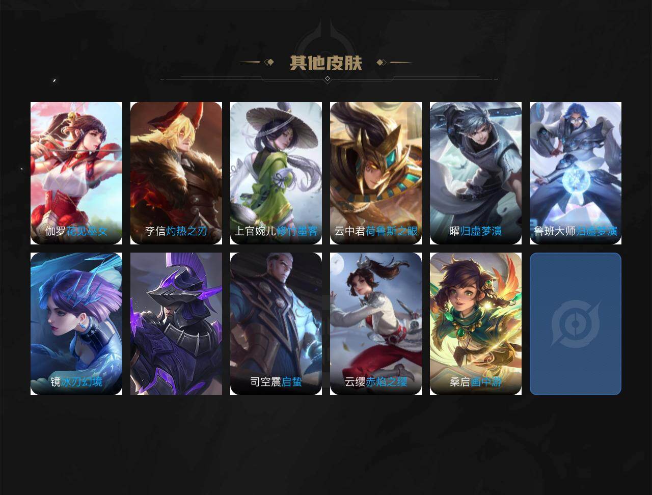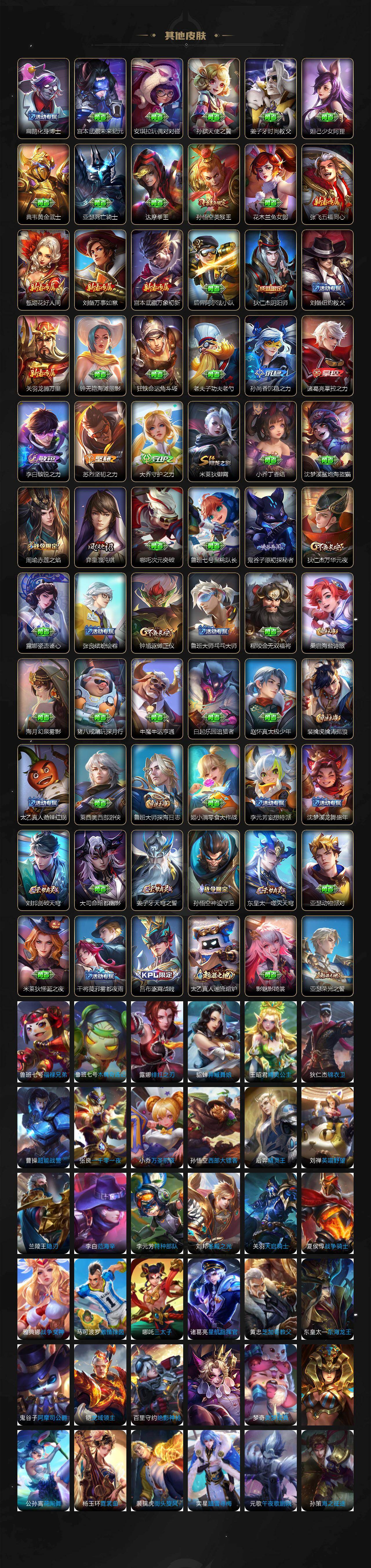 【其他皮肤】:项羽海滩派对,韩信教廷特使,达摩大发明家,赵云白执事,赵云忍炎影,牛魔西部大镖客,扁鹊化身博士,宫本武藏未来纪元,安琪拉玩偶对对碰,孙膑天使之翼,姜子牙时尚教父,妲己少女阿狸,典韦黄金武士,亚瑟死亡骑士,达摩拳王,孙悟空美猴王,花木兰兔女郎,张飞五福同心,甄姬花好人间,刘备万事如意,宫本武藏万象初新,后羿阿尔法小队,狄仁杰阴阳师,刘备纽约教父,关羽龙腾万里,钟无艳海滩丽影,狂铁命运角斗场,老夫子功夫老勺,孙尚香沉稳之力,诸葛亮掌控之力,李白敏锐之力,苏烈坚韧之力,大乔守护之力,米莱狄御霄,小乔丁香结,沈梦溪鲨炮海盗猫,周瑜赤莲之焰,弈星混沌棋,哪吒次元突破,鲁班七号黑桃队长,鬼谷子原初探秘者,狄仁杰万华元夜,露娜瓷语鉴心,张良缤纷绘卷,钟馗驱傩正仪,鲁班大师乓乓大师,程咬金无双福将,桑启海盐诗旅,海