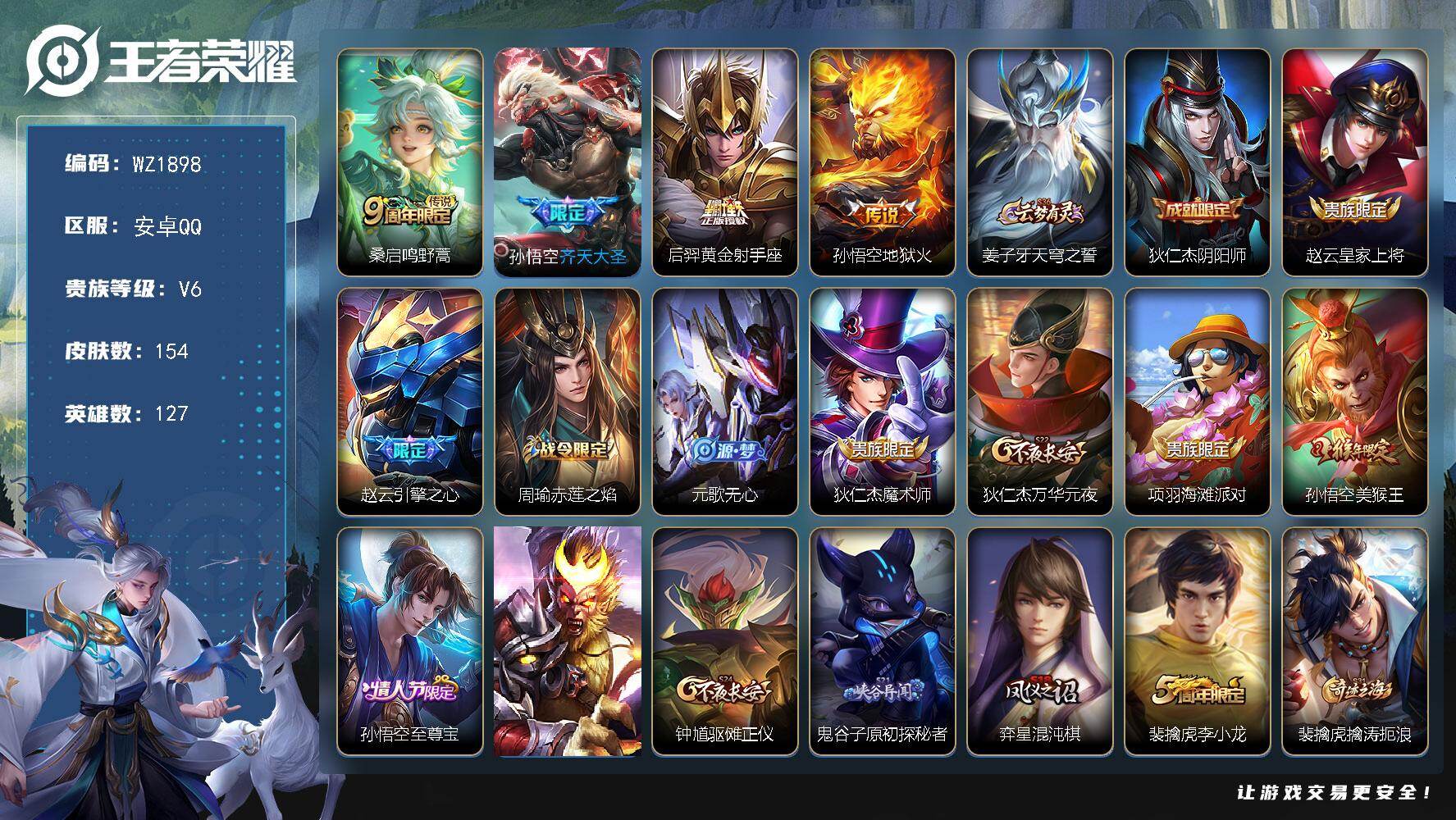 - [14158417]可二次【店主推荐捡漏号!可直接换绑】:安卓Q-V6-至尊星耀IV段位-126英雄-196皮肤-5传说-2星元-52史诗 【传说皮肤】:虞姬愿照岁时盈,桑启鸣野蒿,花木兰冠军飞将,后羿黄金射手座,孙尚香末日机甲 【限定皮肤】:姜子牙天穹之誓,狄仁杰阴阳师,赵云皇家上将,鲁班七号狮舞东方,庄周高山流水,高渐离玩趣恶龙,阿轲迷踪丽影,元歌无心,夏侯惇朔风刀,典韦蓝屏警告,马可波罗暗影游猎,狄仁杰魔术师,狄仁杰万华元夜,达摩沙漠行僧,项羽海滩派对,老夫子醍醐杖,刘邦夺宝奇兵,亚瑟潮玩骑士王,孙悟空至尊宝,牛魔御旌,李元芳银河之约,李元芳云中旅人,钟馗神迹守卫,钟馗驱傩正仪,女娲朔望之晖,雅典娜单词大作战,蔡文姬繁星吟游,鬼谷子原初探秘者,鬼谷子五谷丰年,苏烈千军破阵,弈星混沌棋,沈梦溪星空之诺,沈梦溪大漠名商,明世隐疑决卦,裴擒虎李小龙,裴擒虎擒涛扼浪,米莱狄御霄,云中君纤云弄巧,盾山御銮,猪八戒西部大镖客,上官婉儿梁祝,蒙犽狂想玩偶喵,鲁班大师探海日志,桑启海盐诗旅,艾琳女武神,阿古朵江河有灵,张良古海寻踪,蒙恬荣光圣徽,鬼谷子天穹祈灯,刘邦剑破天穹,周瑜熔金海岸 【赛季限定】:夏侯惇朔风刀,狄仁杰万华元夜,达摩沙漠行僧,老夫子醍醐杖,张良古海寻踪,牛魔御旌,李元芳云中旅人,钟馗驱傩正仪,鬼谷子原初探秘者,苏烈千军破阵,弈星混沌棋,沈梦溪大漠名商,明世隐疑决卦,裴擒虎擒涛扼浪,米莱狄御霄,盾山御銮,鲁班大师探海日志,桑启海盐诗旅,鬼谷子天穹祈灯,蒙恬荣光圣徽,刘邦剑破天穹,姜子牙天穹之誓 【战令限定】:鲁班七号狮舞东方,阿轲迷踪丽影,典韦蓝屏警告,马可波罗暗影游猎,刘邦夺宝奇兵,亚瑟潮玩骑士王,李元芳银河之约,钟馗神迹守卫,女娲朔望之晖,雅典娜单词大作战,沈梦溪星空之诺,猪八戒西部大镖客,蒙犽狂想玩偶喵 【史诗皮肤】:露娜紫霞仙子,赵云皇家上将,赵云未来纪元,貂蝉圣诞恋歌,甄姬冰雪圆舞曲,王昭君偶像歌手,狄仁杰魔术师,宫本武藏鬼剑武藏,孙尚香水果甜心,嬴政摇滚巨星,妲己魅力维加斯,妲己女仆咖啡,墨子金属风暴,曹操幽灵船长,吕布末日机甲,韩信白龙吟,孙悟空至尊宝,夏侯惇乘风破浪,小乔缤纷独角兽,兰陵王暗隐猎兽者,诸葛亮黄金分割率,亚瑟心灵战警,百里守约特工魅影,铠曙光守护者,刘禅天才门将,李元芳逐浪之夏,程咬金功夫厨神,典韦蓝屏警告,伽罗箭羽风息,鲁班七号狮舞东方,狄仁杰