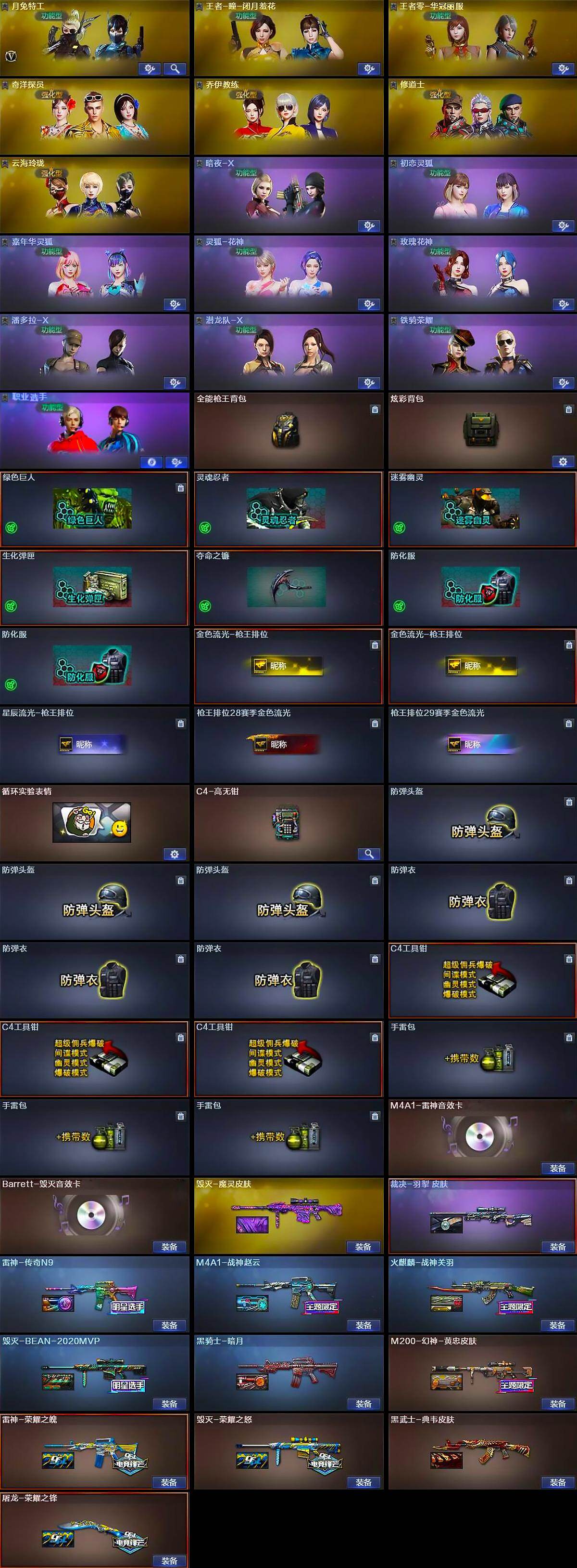 【道具】:全能枪王背包,炫彩背包,哔哩哔哩名片,绿色巨人,灵魂忍者,迷雾幽灵,生化弹匣,夺命之镰,防化服*2,金色流光-枪王排位*2,星辰流光-枪王排位,枪王排位28赛季金色流光,枪王排位29赛季金色流光,循环实验表情,C4-高无钳,防弹头盔*3,防弹衣*3,C4工具钳*3,手雷包*3