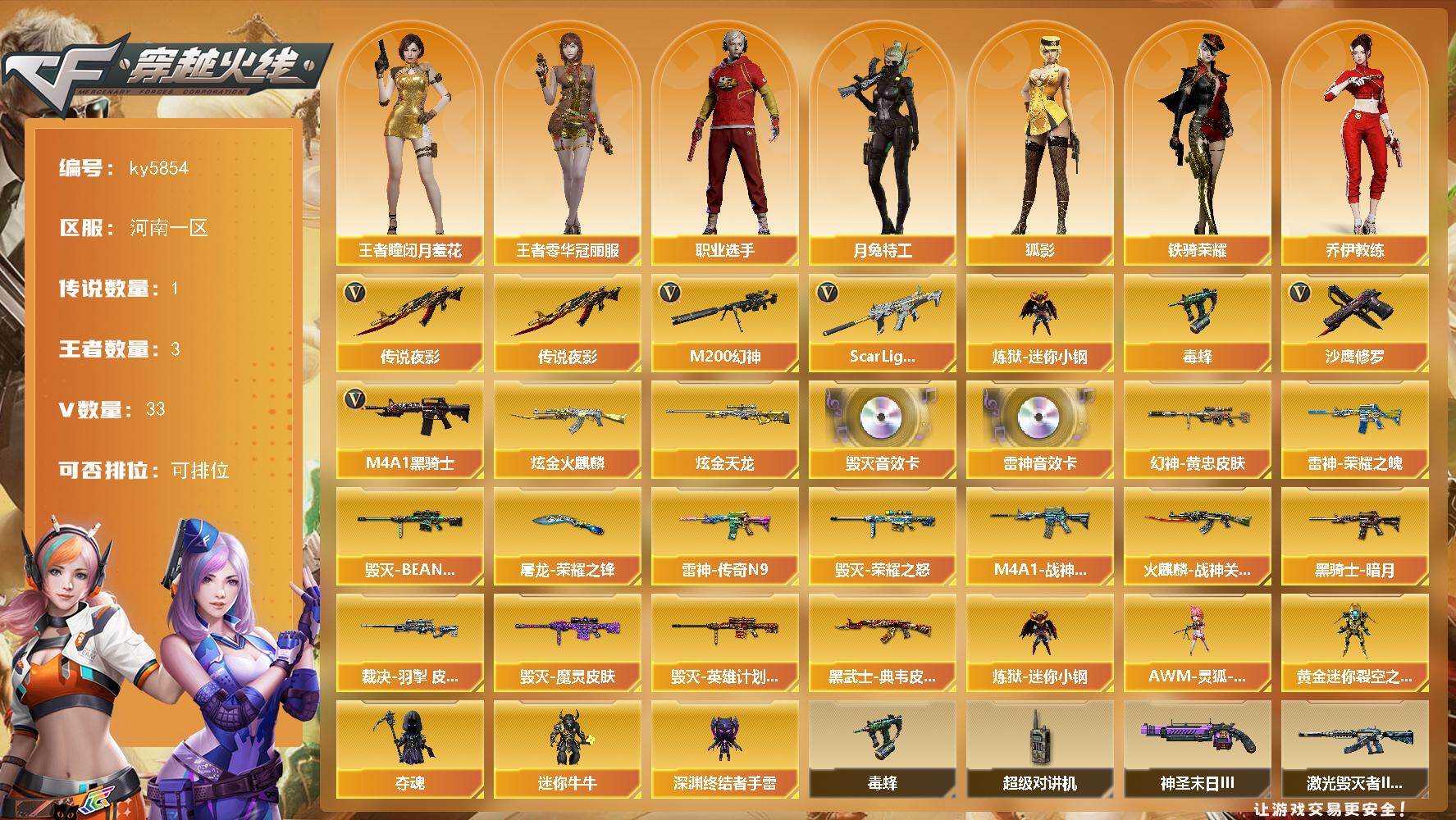 [17017527]河南一区-35V-3王者武器数-2炫金武器数 【传说武器】:传说夜影 【热门武器】:传说夜影,Scar Light-白虎,M200-幻神,炼狱-迷你小钢,毒蜂,M4A1-黑骑士,沙鹰-修罗*2 【王者炫金武器】:炫金火麒麟,炫金天龙 【音效卡】:M4A1-雷神音效卡,Barrett-毁灭音效卡 【皮肤】:M200-幻神-黄忠皮肤,裁决-羽掣 皮肤,雷神-荣耀之魄,雷神-传奇N9,M4A1-战神赵云,火麒麟-战神关羽,毁灭-荣耀之怒,毁灭-BEAN-2020MVP,毁灭-魔灵皮肤,毁灭-英雄计划 皮肤,黑骑士-暗月,黑武士-典韦皮肤,屠龙-荣耀之锋 【角色】:月兔特工,王者-瞳-闭月羞花,王者零-华冠丽服,狐影,奇洋探员,乔伊教练,修道士,云海玲珑,暗夜-X,初恋灵狐,嘉年华灵狐,灵狐-花神,玫瑰花神,潘多拉-X,潜龙队-X,铁骑荣耀,兔囡囡,职业选手 【人偶武器】:炼狱-迷你小钢,AWM-灵狐-15周年嘉年华,黄金迷你裂空之翼,夺魂,迷你牛牛,深渊终结者手雷 【暴走生化】:毒蜂,超级对讲机 【挑战大师】:冰龙粉碎者-白马银枪,激光毁灭者III-白马银枪,神圣爆裂者-末日III 【英雄级武器】:AK47-火麒麟,M4A1-雷神,M4A1-黑骑士,AK47-黑武士,M4A1-武圣,Scar Light-白虎,无影-神兵利器,黑武士-锦绣游龙,Barrett-毁灭,Barrett-极光,AWM-裁决,M200-幻神,王者星神-觉醒版,沙鹰-修罗*2,柯尔特-电竞装甲,Glock18-武圣,屠龙,高爆手雷-雷霆*2,手雷-动感闪耀,闪光弹-雷霆*2,闪光弹-雷霆王者-觉醒版,烟雾弹-雷霆*2,M4A1-赤狱骑士 【道具】:全能枪王背包,炫彩背包,哔哩哔哩名片,绿色巨人,灵魂忍者,迷雾幽灵,生化弹匣,夺命之镰,防化服*2,金色流光-枪王排位*2,星辰流光-枪王排位,枪王排位28赛季金色流光,枪王排位29赛季金色流光,循环实验表情,C4-高无钳,防弹头盔*3,防弹衣*3,C4工具钳*3,手雷包*3 【特殊枪械】:1白虎,1黑骑士