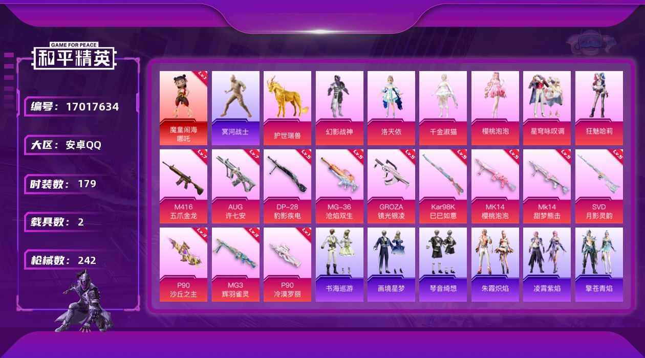 [17017634]安卓 手Q-2神装-6粉装-12特效枪-2载具-8粉色飞行器-83242热力值-12王牌印记-179套装-242枪皮