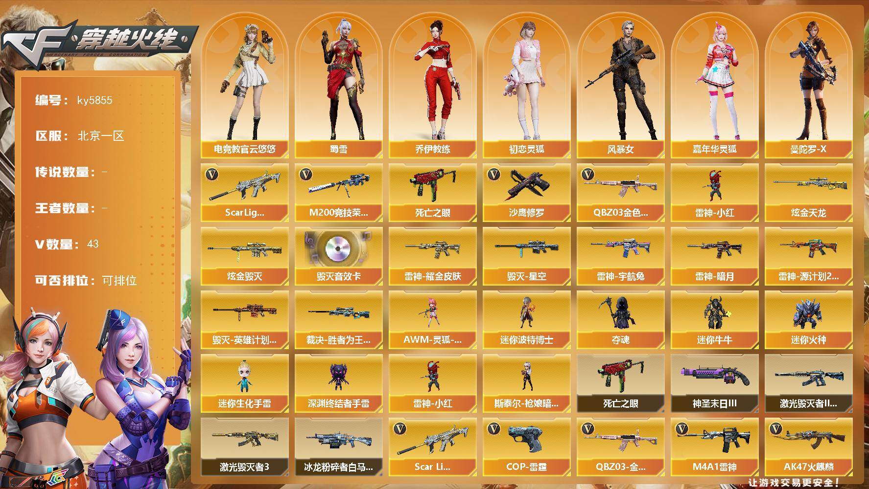 [17017739]北京一区-45V-0王者武器数-2炫金武器数 【热门武器】:QBZ03-金色蔷薇,Scar Light-白虎,M200-竞技荣光,死亡之眼,雷神-小红,沙鹰-修罗*3 【王者炫金武器】:炫金毁灭,炫金天龙 【音效卡】:Barrett-毁灭音效卡 【皮肤】:裁决-胜者为王 皮肤,雷神-暗月,雷神-耀金皮肤,雷神-宇航兔皮肤,雷神-源计划2.0专属 皮肤,毁灭-星空,毁灭-英雄计划 皮肤 【角色】:电竞教官-云悠悠,乔伊教练,初恋灵狐,风暴女,嘉年华灵狐,曼陀罗-X,潘多拉-X,潘多拉-甜心教官,蜀雪,兔囡囡,新娜塔莎 【人偶武器】:雷神-小红,斯泰尔-枪娘暗刃,AWM-灵狐-15周年嘉年华,迷你波特博士*2,夺魂,迷你牛牛,迷你火种,迷你生化手雷,深渊终结者手雷 【暴走生化】:死亡之眼 【挑战大师】:冰龙粉碎者-白马银枪,激光毁灭者III-白马银枪,激光毁灭者III,神圣爆裂者-末日III 【英雄级武器】:AK47-火麒麟,M4A1-雷神,AK12-天启,Scar Light-白虎,无影-神兵利器,QBZ03-金色蔷薇,烈火-动感闪耀,Barrett-毁灭,AWM-裁决,M200-竞技荣光,沙鹰-修罗*3,沙鹰-天神,COP-雷霆,柯尔特-竞技荣光,天神-动感闪耀,擎天-竞技荣光,屠龙-动感闪耀,高爆手雷-竞技荣光*6,手雷-动感闪耀,闪光弹-竞技荣光*7,烟雾弹-竞技荣光*6 【道具】:CFS限定背包,冰冰企鹅背包,绿色巨人,灵魂忍者,迷雾幽灵,夺命之镰,防化服*3,金色流光-枪王排位*2,星辰流光-枪王排位,枪王排位28赛季金色流光,动感闪耀表情,EP战队名片,防弹头盔*3,防弹衣*3,C4工具钳*3,手雷包*3 【特殊枪械】:1白虎