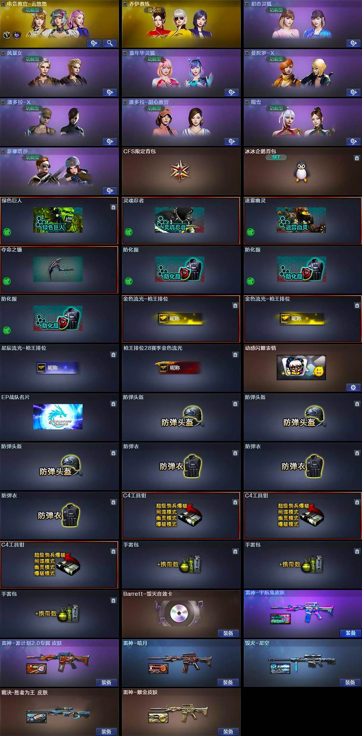 【道具】:CFS限定背包,冰冰企鹅背包,绿色巨人,灵魂忍者,迷雾幽灵,夺命之镰,防化服*3,金色流光-枪王排位*2,星辰流光-枪王排位,枪王排位28赛季金色流光,动感闪耀表情,EP战队名片,防弹头盔*3,防弹衣*3,C4工具钳*3,手雷包*3