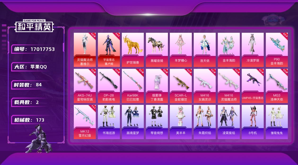 [17017753]苹果 手Q-2神装-4粉装-12特效枪-2载具-5粉色飞行器-56777热力值-13王牌印记-84套装-173枪皮