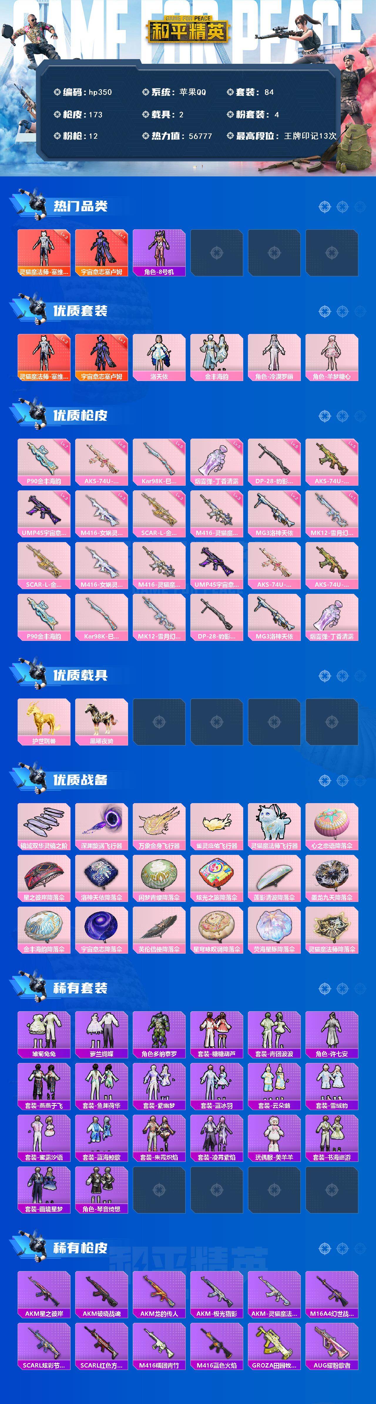 [17017753]苹果 手Q-2神装-4粉装-12特效枪-2载具-5粉色飞行器-56777热力值-13王牌印记-84套装-173枪皮 【红色神装等级】:灵猫魔法师-塞维尔(三级),宇宙意志-塞卢姆(一级) 【红色角色神装】:灵猫魔法师-塞维尔,宇宙意志-塞卢姆 【热门品类】:角色-8号机 【粉色套装】:角色-洛天依,粉装-金丰海韵,角色-冷漠罗丽,角色-羊梦糖心 【粉色枪皮等级】:SCAR-L-金蛇镇世(三级),M416-女娲灵识(三级),M416-灵猫魔法师(三级),UMP45-宇宙意志(三级),AKS-74U-星穹咏叹调(六级),AKS-74U-森灵之息(五级),P90-金丰海韵(七级),Kar98K-巳巳如意(五级),MK12-雪月幻音(一级),DP-28-豹影疾电(五级),MG3-洛神天依(二级),烟雾弹-丁香清露(五级) 【粉色载具】:护世瑞兽,黑曜夜骑 【粉色枪皮】:SCAR-L-金蛇镇世,M416-女娲灵识,M416-灵猫魔法师,UMP45-宇宙意志,AKS-74U-星穹咏叹调,AKS-74U-森灵之息,P90-金丰海韵,Kar98K-巳巳如意,MK12-雪月幻音,DP-28-豹影疾电,MG3-洛神天依,烟雾弹-丁香清露 【粉色飞行器】:镜域双华-灵镜之阶,深渊漩涡飞行器,万象金身飞行器,雀灵庇佑飞行器,灵猫魔法师飞行器 【粉色降落伞】:心之恋语降落伞,星之彼岸降落伞,洛神天依降落伞,闲梦青缨降落伞,炫光之旅降落伞,莲影清波降落伞,墨龙九天降落伞,金丰海韵降落伞,宇宙意志降落伞,英伦信使降落伞,星穹咏叹调降落伞,荧海星豚降落伞,灵猫魔法师降落伞 【稀有套装】:套装-雪国风尚,套装-雏菊兔兔,套装-萝兰蝴蝶,角色-多纳泰罗,套装-糖糖葫芦,套装-青团波波,角色-许七安,套装-燕燕于飞,套装-鱼渊荷华,套装-紫幽梦,套装-蓝冰羽,套装-云朵鹅,套装-雪绒豹,套装-蜜露汐语,套装-蓝海鲸歌,套装-朱霞炽焰,套装-凌霄紫焰,玩偶服-美羊羊,套装-书海巡游,套装-画境星梦,套装-琴音绮想 【稀有枪皮】:AKM-星之彼岸,AKM-破晓战魂,AKM-龙的传人,AKM-灵猫魔法师,AKM-极光猎影,M16A4-幻世战舞者,SCAR-L-炫彩节奏,SCAR-L-红色方程式,M416-糯团青竹,M416-蓝色火焰,GROZA-田园牧歌,AUG-耀粉歌者,AUG-闲梦青缨,AUG-金蛇镇世