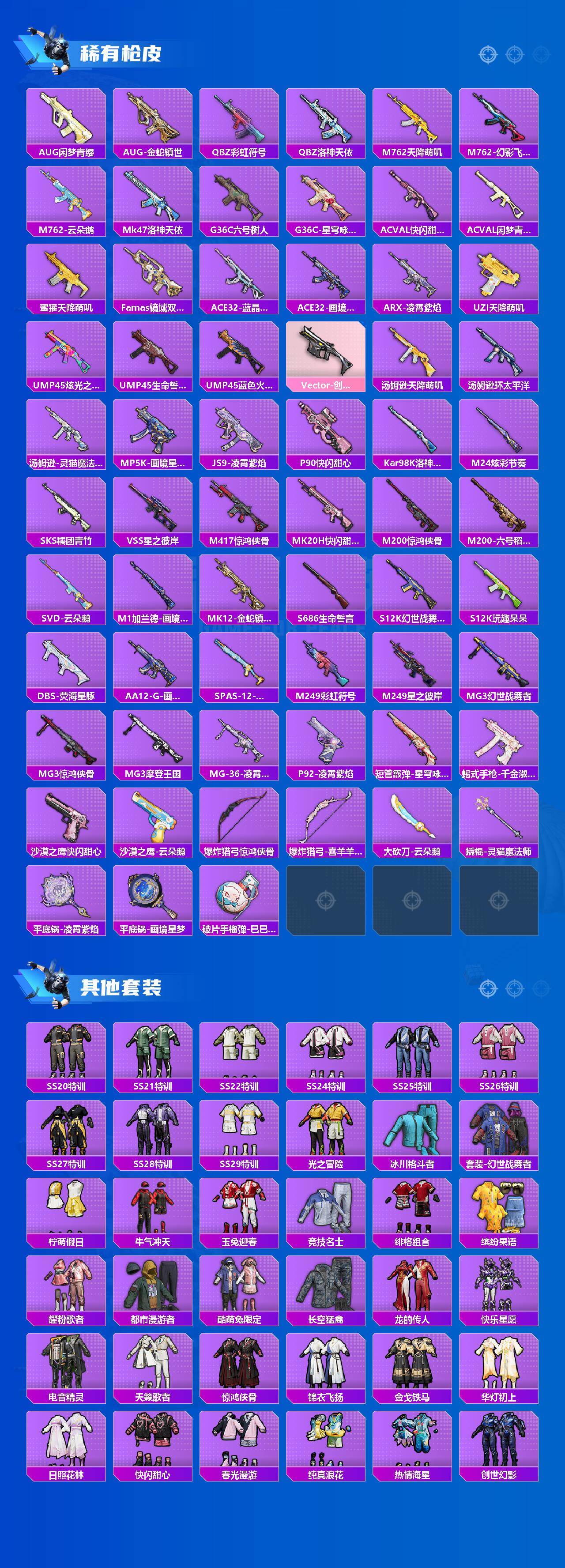 【稀有枪皮】:AKM-星之彼岸,AKM-破晓战魂,AKM-龙的传人,AKM-灵猫魔法师,AKM-极光猎影,M16A4-幻世战舞者,SCAR-L-炫彩节奏,SCAR-L-红色方程式,M416-糯团青竹,M416-蓝色火焰,GROZA-田园牧歌,AUG-耀粉歌者,AUG-闲梦青缨,AUG-金蛇镇世