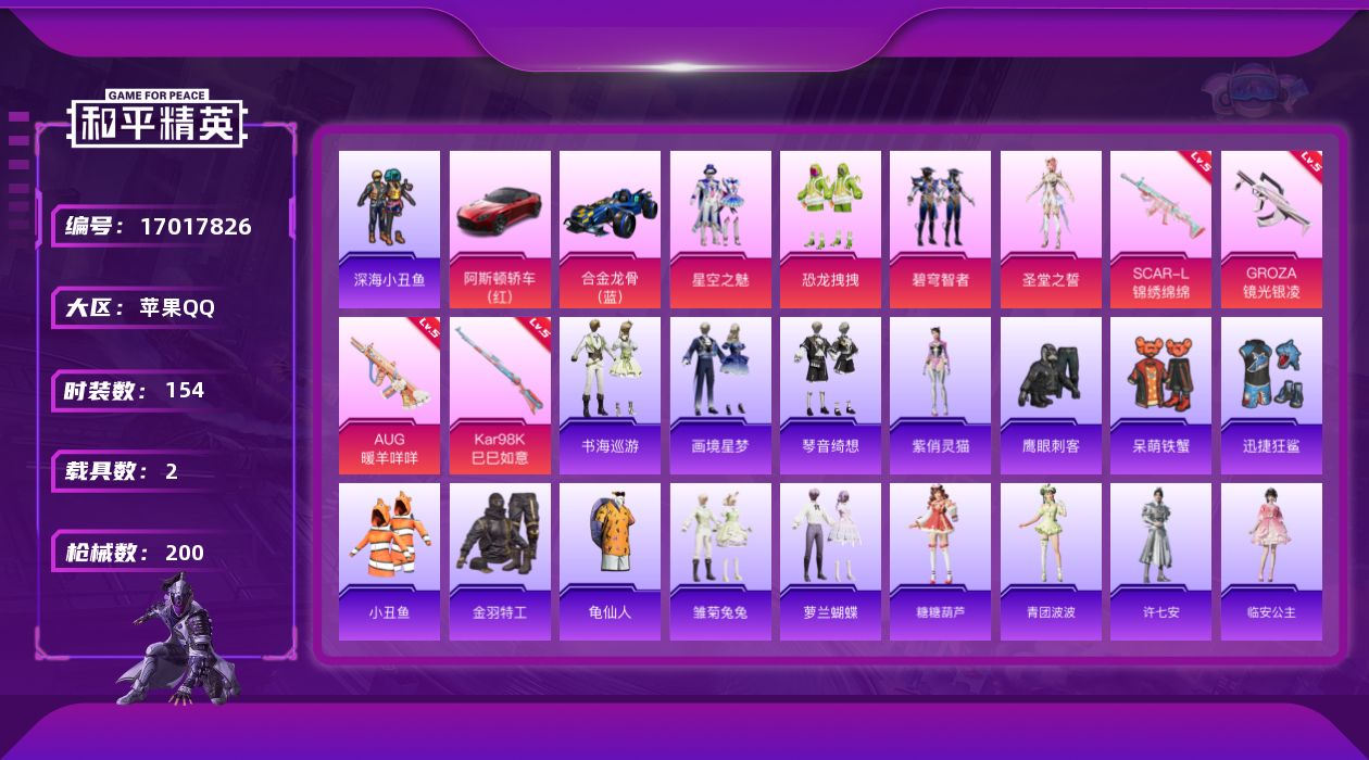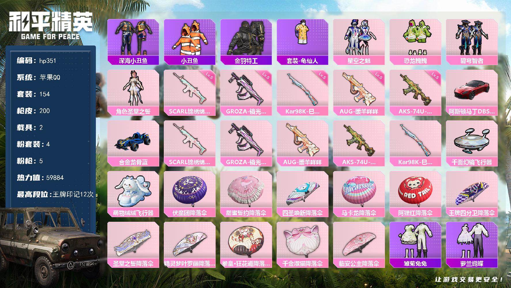 [17017826]苹果 手Q-4粉装-5特效枪-2载具-2粉色飞行器-59884热力值-12王牌印记-154套装-200枪皮