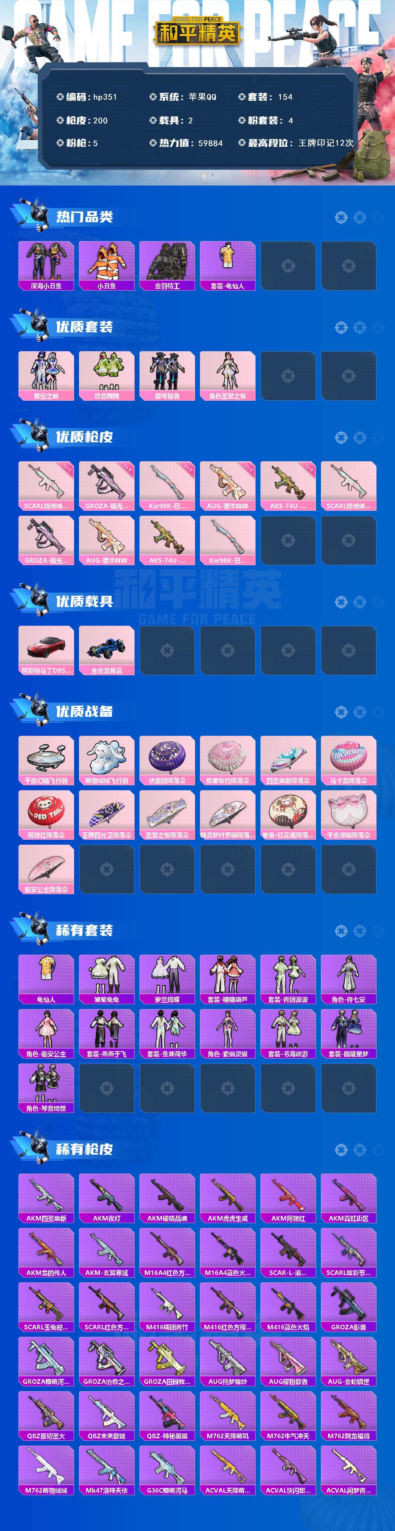 [17017826]苹果 手Q-4粉装-5特效枪-2载具-2粉色飞行器-59884热力值-12王牌印记-154套装-200枪皮 【热门品类】:套装-深海小丑鱼,套装-小丑鱼,套装-金羽特工,套装-龟仙人 【粉色套装】:粉装-星空之魅,粉装-恐龙拽拽,粉装-碧穹智者,角色-圣堂之誓 【粉色枪皮等级】:SCAR-L-锦绣绵绵(五级),GROZA-镜光银凌(五级),AUG-暖羊咩咩(五级),AKS-74U-森灵之息(五级),Kar98K-巳巳如意(五级) 【粉色载具】:阿斯顿马丁DBS(红),合金龙骨(蓝) 【粉色枪皮】:SCAR-L-锦绣绵绵,GROZA-镜光银凌,AUG-暖羊咩咩,AKS-74U-森灵之息,Kar98K-巳巳如意 【粉色飞行器】:千面幻镜飞行器,萌物绒绒飞行器 【粉色降落伞】:伏魔团降落伞,甜蜜誓约降落伞,四圣焕新降落伞,马卡龙降落伞,阿狸红降落伞,王牌四分卫降落伞,圣堂之誓降落伞,精灵梦叶罗丽降落伞,拳皇·狂花道降落伞,千金淑猫降落伞,临安公主降落伞 【稀有套装】:套装-龟仙人,套装-雏菊兔兔,套装-萝兰蝴蝶,套装-糖糖葫芦,套装-青团波波,角色-许七安,角色-临安公主,套装-燕燕于飞,套装-鱼渊荷华,角色-紫俏灵猫,套装-书海巡游,套装-画境星梦,套装-琴音绮想 【稀有枪皮】:AKM-四圣焕新,AKM-夜灯,AKM-破晓战魂,AKM-虎虎生威,AKM-阿狸红,AKM-霓虹街区,AKM-龙的传人,AKM-玄冥寒域,M16A4-红色方程式,M16A4-蓝色火焰,SCAR-L-浪客战士,SCAR-L-炫彩节奏,SCAR-L-玉兔迎春,SCAR-L-红色方程式,M416-糯团青竹,M416-红色方程式,M416-蓝色火焰,GROZA-影袭,GROZA-懵萌河马,GROZA-治愈之星,GROZA-田园牧歌,AUG-纯梦嫁纱,AUG-耀粉歌者,AUG-金蛇镇世,QBZ-原初圣火,QBZ-未来歌姬,QBZ-神秘黑猫,M762-天降萌叽,M762-牛气冲天,M762-瑞龙福将,M762-萌物绒绒,Mk47-洛神天依,G36C-懵萌河马,AC-VAL-天降萌叽,AC-VAL-快闪甜心,AC-VAL-闲梦青缨,蜜獾-天降萌叽,蜜獾-娇憨猪猪,ACE32-画境星梦,UZI-天降萌叽,UZI-娇憨猪猪,UZI-影袭,UZI-炫彩节奏,UMP45-炫光之旅,UMP45-蓝色火焰,Vector