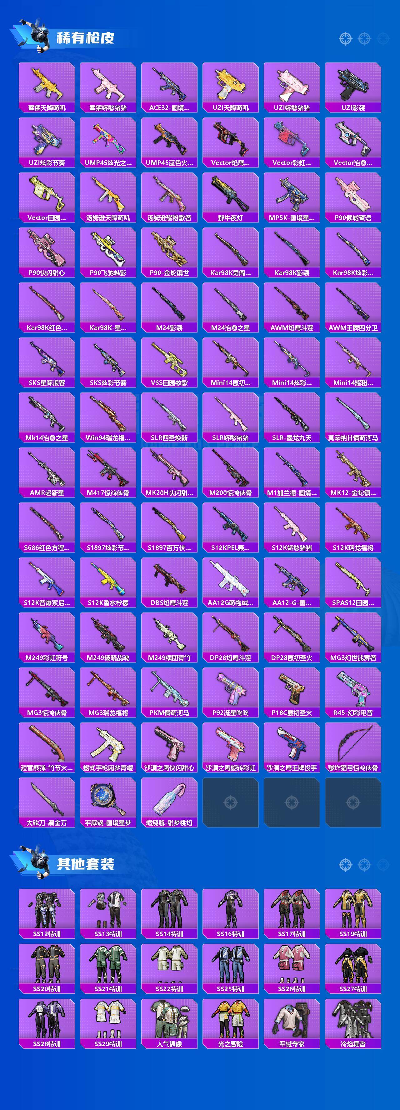 【稀有枪皮】:AKM-四圣焕新,AKM-夜灯,AKM-破晓战魂,AKM-虎虎生威,AKM-阿狸红,AKM-霓虹街区,AKM-龙的传人,AKM-玄冥寒域,M16A4-红色方程式,M16A4-蓝色火焰,SCAR-L-浪客战士,SCAR-L-炫彩节奏,SCAR-L-玉兔迎春,SCAR-L-红色方程式,M416-糯团青竹,M416-红色方程式,M416-蓝色火焰,GROZA-影袭,GROZA-懵萌河马,GROZA-治愈之星,GROZA-田园牧歌,AUG-纯梦嫁纱,AUG-耀粉歌者,AUG-金蛇镇世,QBZ-原初圣火,QBZ-未来歌姬,QBZ-神秘黑猫,M762-天降萌叽,M762-牛气冲天,M762-瑞龙福将,M762-萌物绒绒,Mk47-洛神天依,G36C-懵萌河马,AC-VAL-天降萌叽,AC-VAL-快闪甜心,AC-VAL-闲梦青缨,蜜獾-天降萌叽,蜜獾-娇憨猪猪,ACE32-画境星梦,UZI-天降萌叽,UZI-娇憨猪猪,UZI-影袭,UZI-炫彩节奏,UMP45-炫光之旅,UMP45-蓝色火焰,Vector