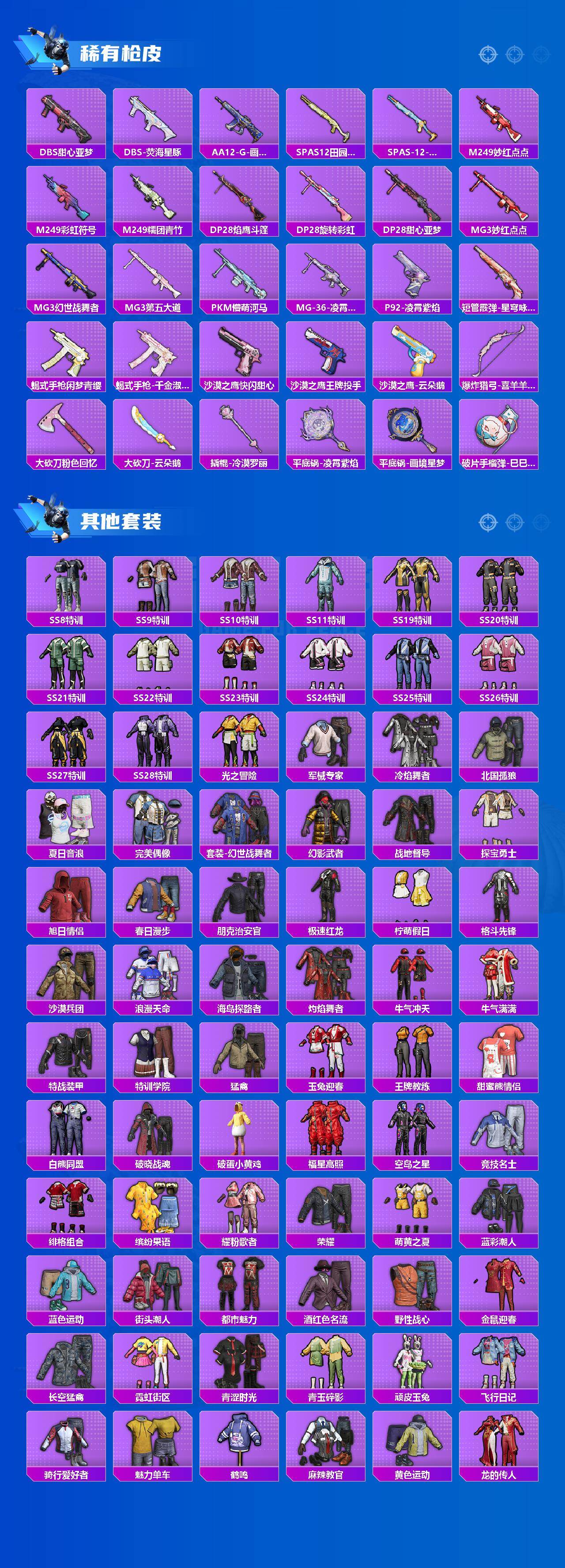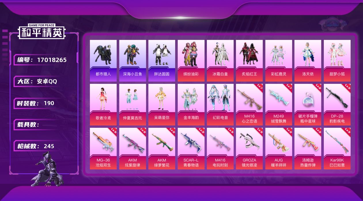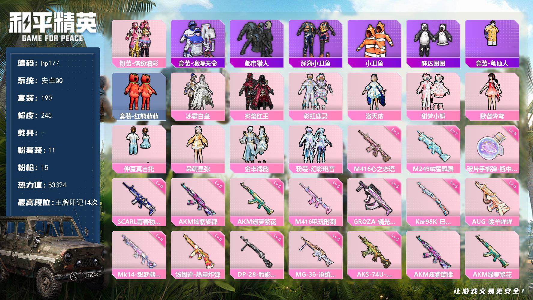 [17018265]安卓 手Q-11粉装-15特效枪-0载具-3粉色飞行器-83324热力值-14王牌印记-190套装-245枪皮 【热门品类】:粉装-缤纷油彩,套装-浪漫天命,套装-都市猎人,套装-深海小丑鱼,套装-小丑鱼,套装-胖达圆圆,套装-龟仙人,套装-红熊茄茄 【粉色套装】:粉装-缤纷油彩,粉装-冰霜白皇,粉装-炙焰红王,粉装-彩虹鹿灵,角色-洛天依,粉装-甜梦小狐,角色-歌者泠鸢,粉装-仲夏莫吉托,角色-呆萌星弥,粉装-金丰海韵,粉装-幻彩电音 【粉色枪皮等级】:AKM-炫紫旋律(五级),AKM-绿萝繁花(五级),SCAR-L-青春物语(五级),M416-心之恋语(七级),M416-电玩时刻(五级),GROZA-镜光银凌(五级),AUG-暖羊咩咩(五级),汤姆逊-热量炸弹(五级),AKS-74U-森灵之息(五级),Kar98K-巳巳如意(五级),Mk14-甜梦熊击(五级),M249-绒雪飘舞(七级),DP-28-豹影疾电(五级),MG-36-沧焰双生(五级),破片手榴弹-瓶中星球(六级) 【粉色枪皮】:AKM-炫紫旋律,AKM-绿萝繁花,SCAR-L-青春物语,M416-心之恋语,M416-电玩时刻,GROZA-镜光银凌,AUG-暖羊咩咩,汤姆逊-热量炸弹,AKS-74U-森灵之息,Kar98K-巳巳如意,Mk14-甜梦熊击,M249-绒雪飘舞,DP-28-豹影疾电,MG-36-沧焰双生,破片手榴弹-瓶中星球 【粉色飞行器】:炫彩糖果飞行器,童趣迷兔飞行器 【粉色降落伞】:绝对恒星降落伞,夏日绵绵冰降落伞,童趣迷兔降落伞,蓝莓炮弹降落伞,橘柚倾心降落伞,星夜魔法师降落伞,妙趣可丽降落伞,仲夏莫吉托降落伞,圣堂之誓降落伞,精灵梦叶罗丽降落伞,戏水时光降落伞,幻彩电音降落伞,喜羊羊与灰太狼降落伞,炫彩糖果降落伞,罪夜之冕降落伞 【稀有套装】:套装-龟仙人,套装-巳巳如意,套装-雪国风尚,套装-炫彩糖果,套装-糖糖葫芦,套装-青团波波,套装-棉花软糖,角色-都市丽猫,角色-摩登魅猫,套装-燕燕于飞,套装-鱼渊荷华,套装-白辉玉蕊,套装-粉恋花,套装-紫幽梦,套装-蓝冰羽,套装-星渊小夜曲,套装-彩虹兔,套装-云朵鹅,套装-雪绒豹,套装-蓝海鲸歌,套装-朱霞炽焰,套装-凌霄紫焰,套装-擎苍青焰,玩偶服-懒羊羊,玩偶服-美羊羊,套装-书海巡游,套装-画境星梦,套装-琴音绮想 【稀有