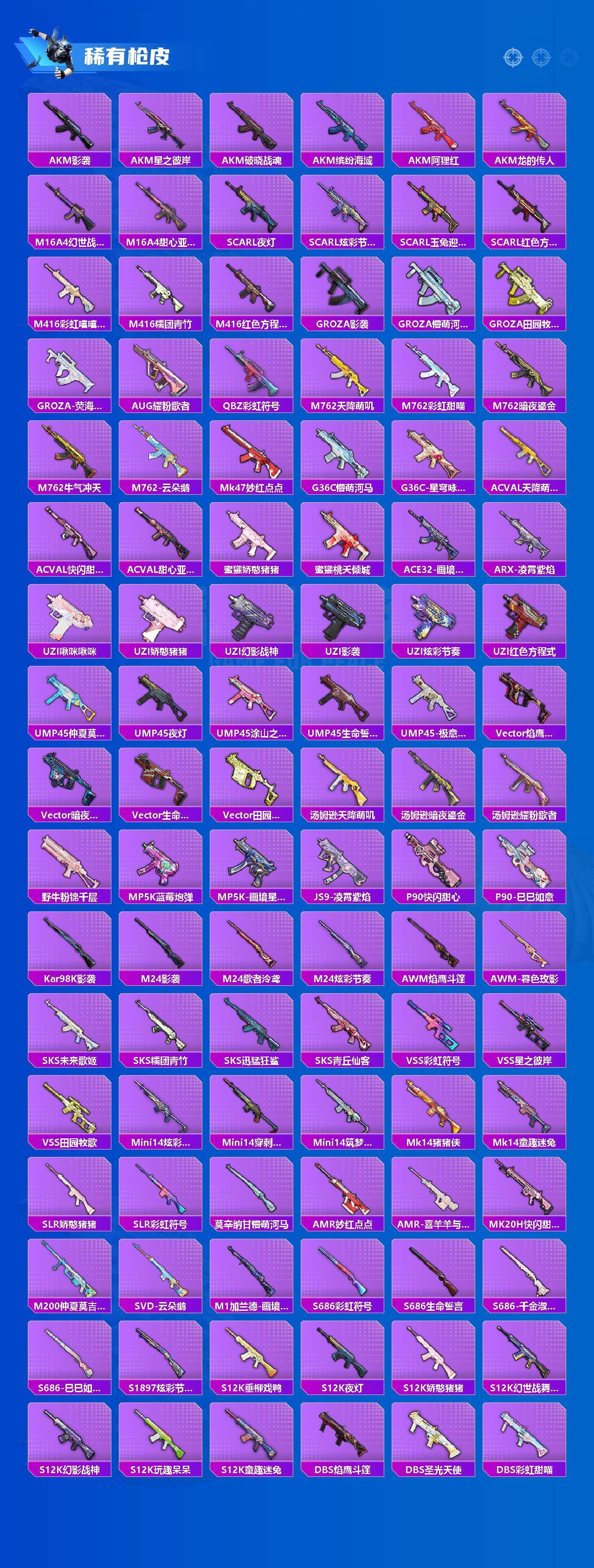【粉色枪皮】:AKM-炫紫旋律,AKM-绿萝繁花,SCAR-L-青春物语,M416-心之恋语,M416-电玩时刻,GROZA-镜光银凌,AUG-暖羊咩咩,汤姆逊-热量炸弹,AKS-74U-森灵之息,Kar98K-巳巳如意,Mk14-甜梦熊击,M249-绒雪飘舞,DP-28-豹影疾电,MG-36-沧焰双生,破片手榴弹-瓶中星球