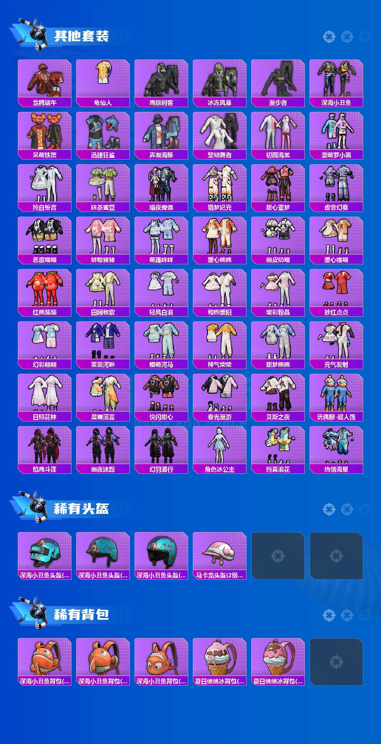 套装-缤纷油彩,套装-都市猎人,套装-深海小丑鱼,套装-胖达圆圆,套装-炙焰红王,套装-彩虹鹿灵,角色-洛天依,套装-甜梦小狐,角色-歌者泠鸢,套装-仲夏莫吉托,角色-呆萌星弥,套装-金丰海韵,套装-鹰眼刺客,套装-呆萌铁蟹,套装-迅捷狂鲨,套装-恶魔喵喵