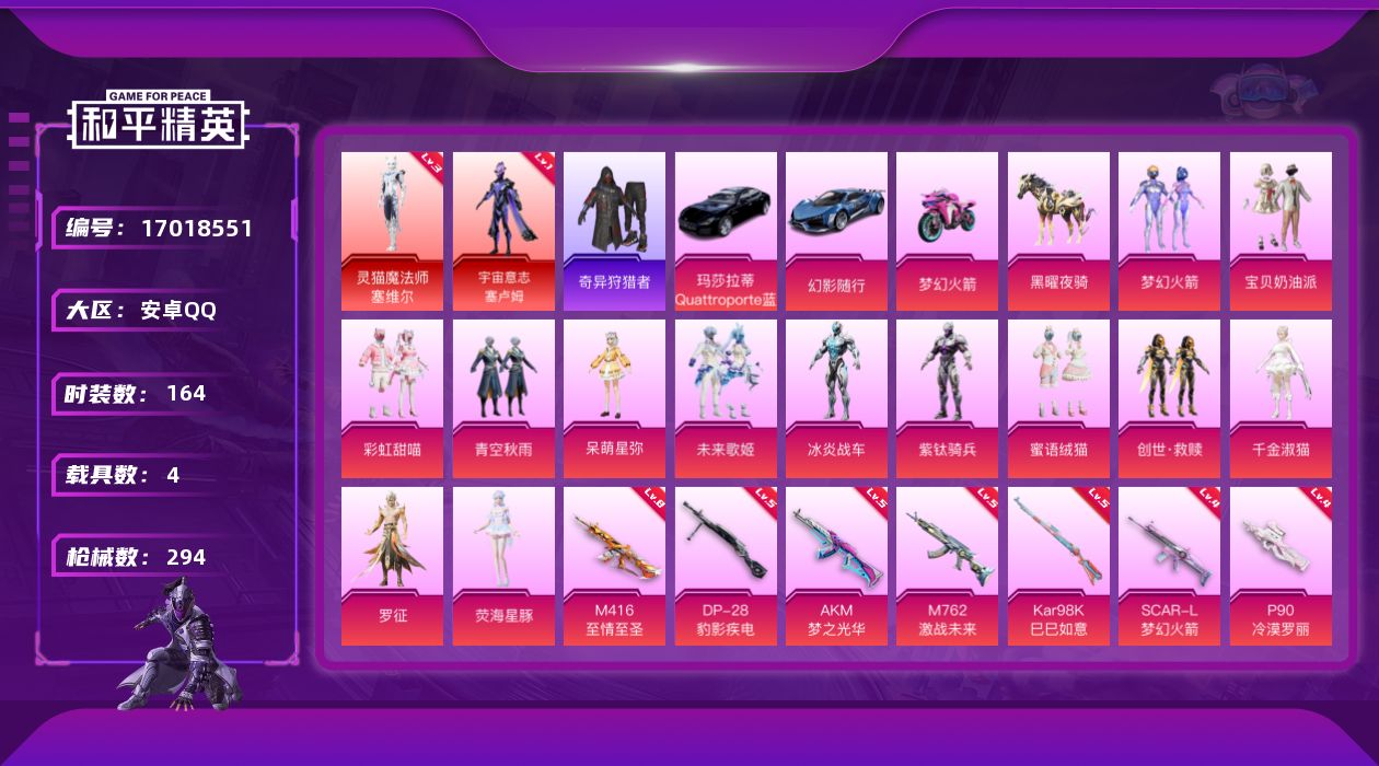 [17018551]安卓 手Q-2神装-13粉装-17特效枪-4载具-13粉色飞行器-106067热力值-7王牌印记-164套装-294枪皮