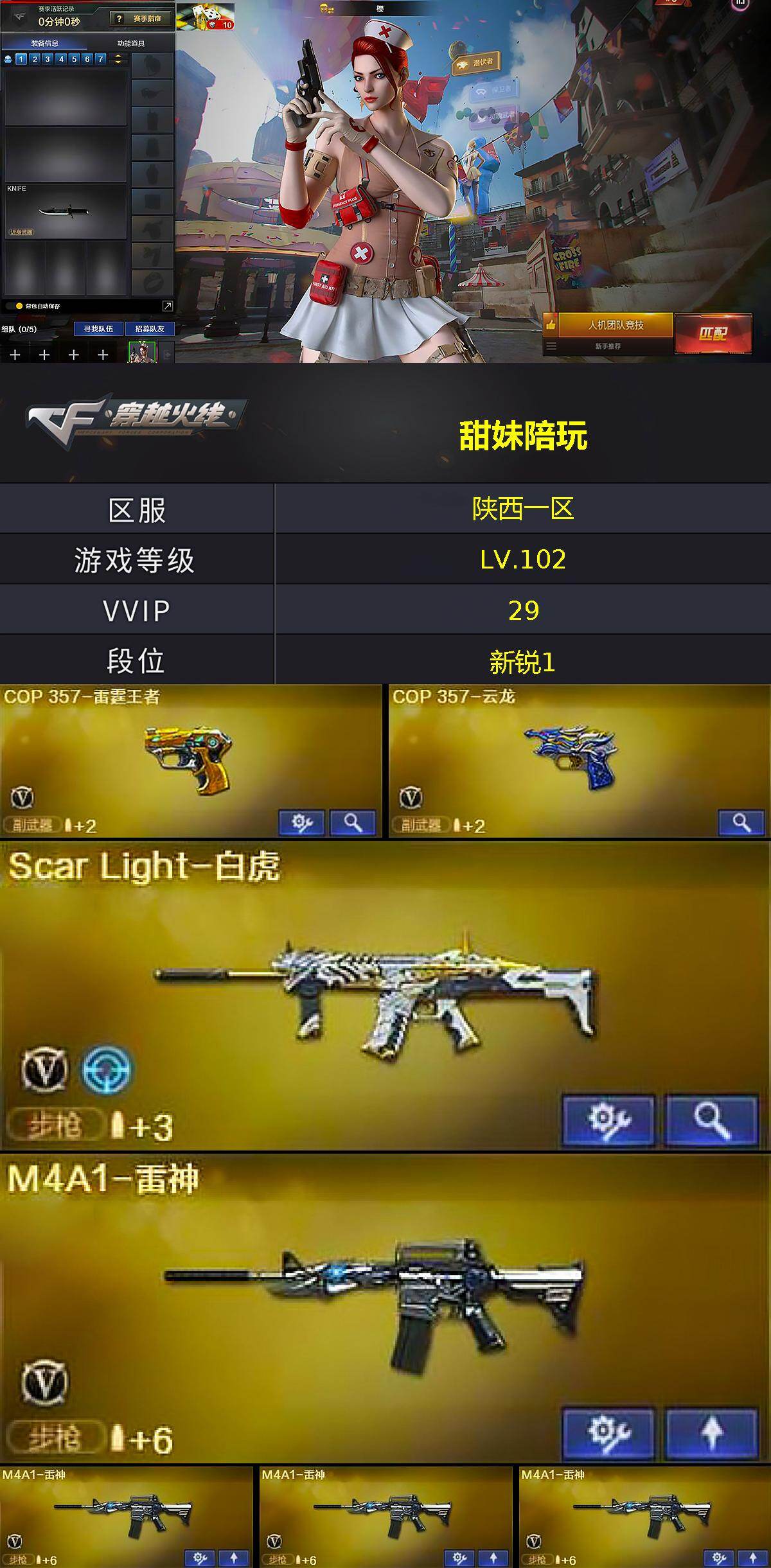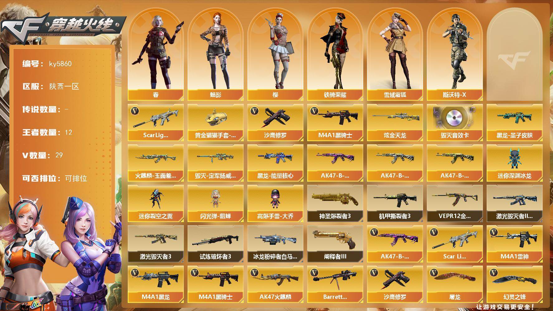 [17018835]陕西一区-40V-12王者武器数-1炫金武器数 【热门武器】:Scar Light-白虎,M4A1-黑骑士*4,沙鹰-修罗*5,黄金猫猫手套-白鲨 【王者炫金武器】:炫金天龙 【音效卡】:Barrett-毁灭音效卡 【皮肤】:火麒麟-玉面羞花 皮肤,毁灭-定军扬威 皮肤,黑龙-能量核心,黑龙-墨子皮肤,AK47-B-常胜将军-曹操,AK47-B-常胜将军-刘备,AK47-B-常胜将军-孙权 【角色】:樱,魅影,春,雪域霜狐,斯沃特-X,铁骑荣耀 【人偶武器】:迷你深渊冰龙,迷你裂空之翼*3,闪光弹-貂蝉,高爆手雷-大乔 【挑战大师】:神圣爆裂者III,冰龙粉碎者-白马银枪,激光毁灭者III-白马银枪,VEPR-12-金魔,激光毁灭者III*2,机甲撕裂者III,试炼破坏者III,阐释者III 【英雄级武器】:AK47-火麒麟,M4A1-黑龙,M4A1-雷神*4,M4A1-黑骑士*4,Scar Light-白虎,AK47-B-常胜将军,Barrett-毁灭,炼狱-悦蓝-觉醒版,悦蓝-惊涛骇浪-觉醒版,沙鹰-修罗*5,COP 357-雷霆王者-觉醒版,COP 357-云龙,屠龙,幻灵之锋,王者之啸-觉醒版,王者之击-觉醒版,雷霆王者之锋-觉醒版,闪光弹-幻灵,闪光弹-雷霆王者-觉醒版*5,烟雾弹-云龙 【道具】:神秘礼盒背包,AG战队炫彩背包,EP战队炫彩背包,KZ战队炫彩背包,炫彩背包,裂空之翼背包-金色,超级背包,雪域霜狐炫彩背包,黄金巨石泰坦-魔花研究所背包,女皇终结者-魔龙之吻,绿色巨人,灵魂忍者,迷雾幽灵,夺命之镰,防化服*2,雪域霜狐表情,防弹头盔*2,防弹衣*2,C4工具钳*2,手雷包*2 【特殊枪械】:1白虎,4黑骑士