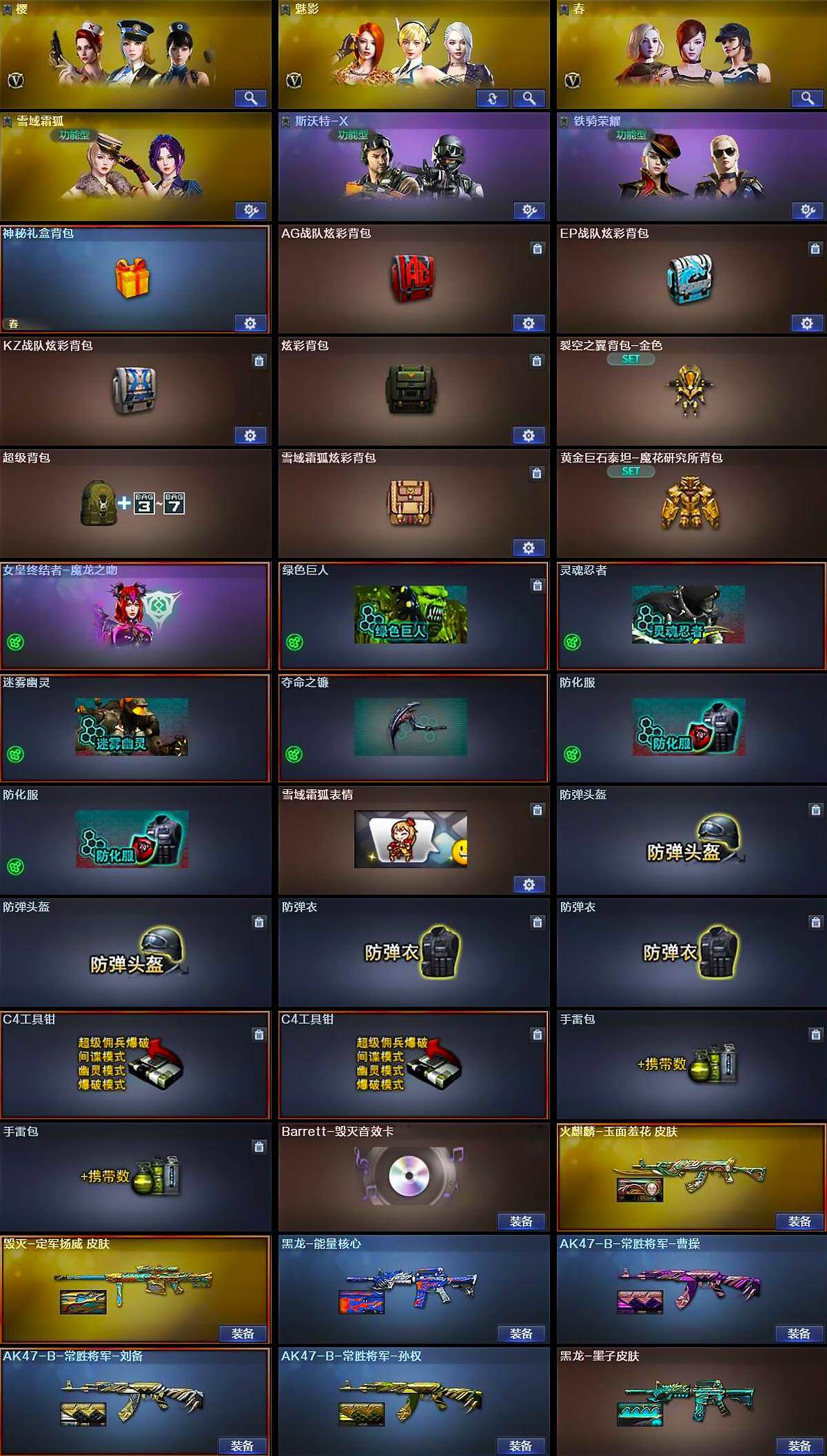 【道具】:神秘礼盒背包,AG战队炫彩背包,EP战队炫彩背包,KZ战队炫彩背包,炫彩背包,裂空之翼背包-金色,超级背包,雪域霜狐炫彩背包,黄金巨石泰坦-魔花研究所背包,女皇终结者-魔龙之吻,绿色巨人,灵魂忍者,迷雾幽灵,夺命之镰,防化服*2,雪域霜狐表情,防弹头盔*2,防弹衣*2,C4工具钳*2,手雷包*2
